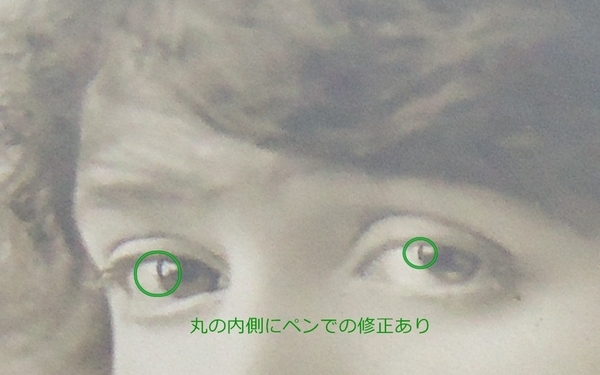 黒目と白目を横切るように照明機材が映りこんで瞳の輪郭が崩れたようで、黒ペンで修正した跡が残っています。画像加工ソフトが無い時代の修正例として面白いと思います。