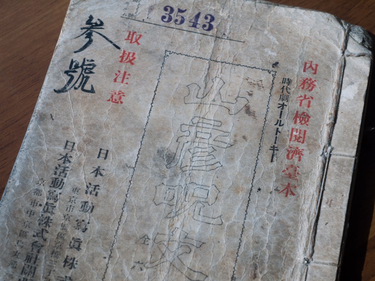 表紙には朱で「内務省検閲済台本」と「取扱注意」のハンコあり。表紙を開くと「注意」の題の下、「此台本ハ内務省ノ公文書ニ付キ内部ヲ訂正又ハ汚損セザル様願ヒマス」などの注意書あり。