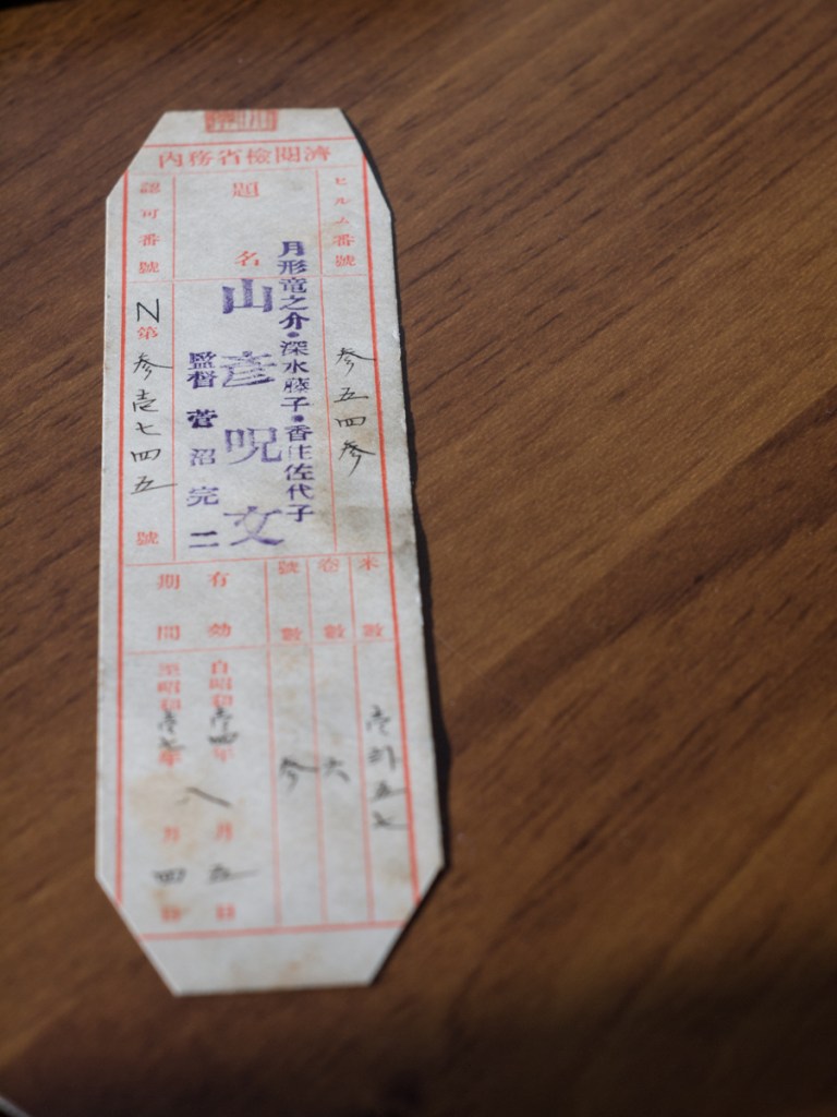 次ページには「注意」として「検閲済ノ”フイルム”又ハ台本ノ内容ヲ加除変更シタルトキハ其ノ検閲ノ効力ヲ失ヒ該当”フイルム”ノ上映ヲ禁止セラルル虞アルヲ以テ注意セラレ度シ」