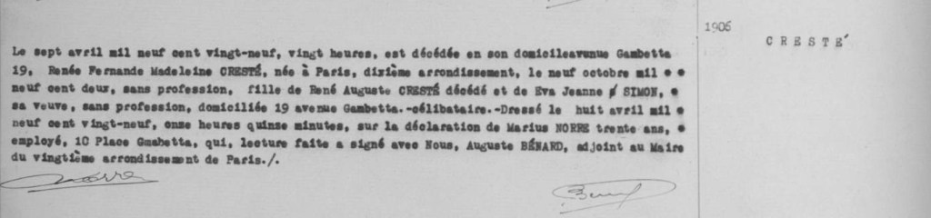 [11] Acte de décès n° 1906 (vue 22/31). Archives en ligne de la Ville de Paris, état-civil du 20ème arrondissement, registre des décès de 1929.