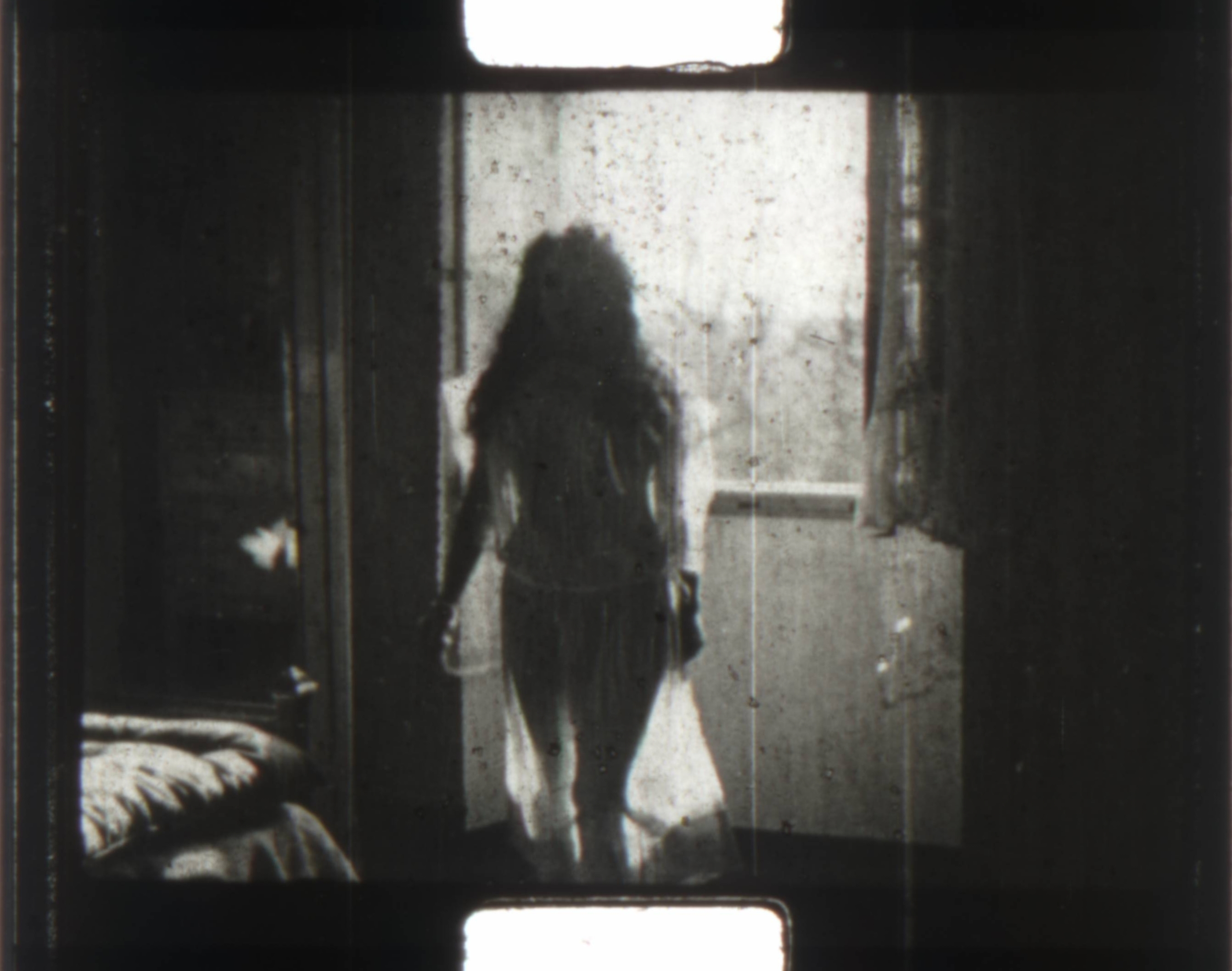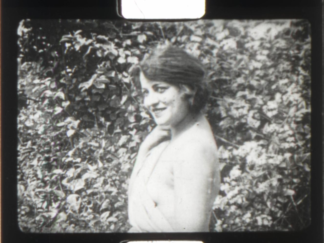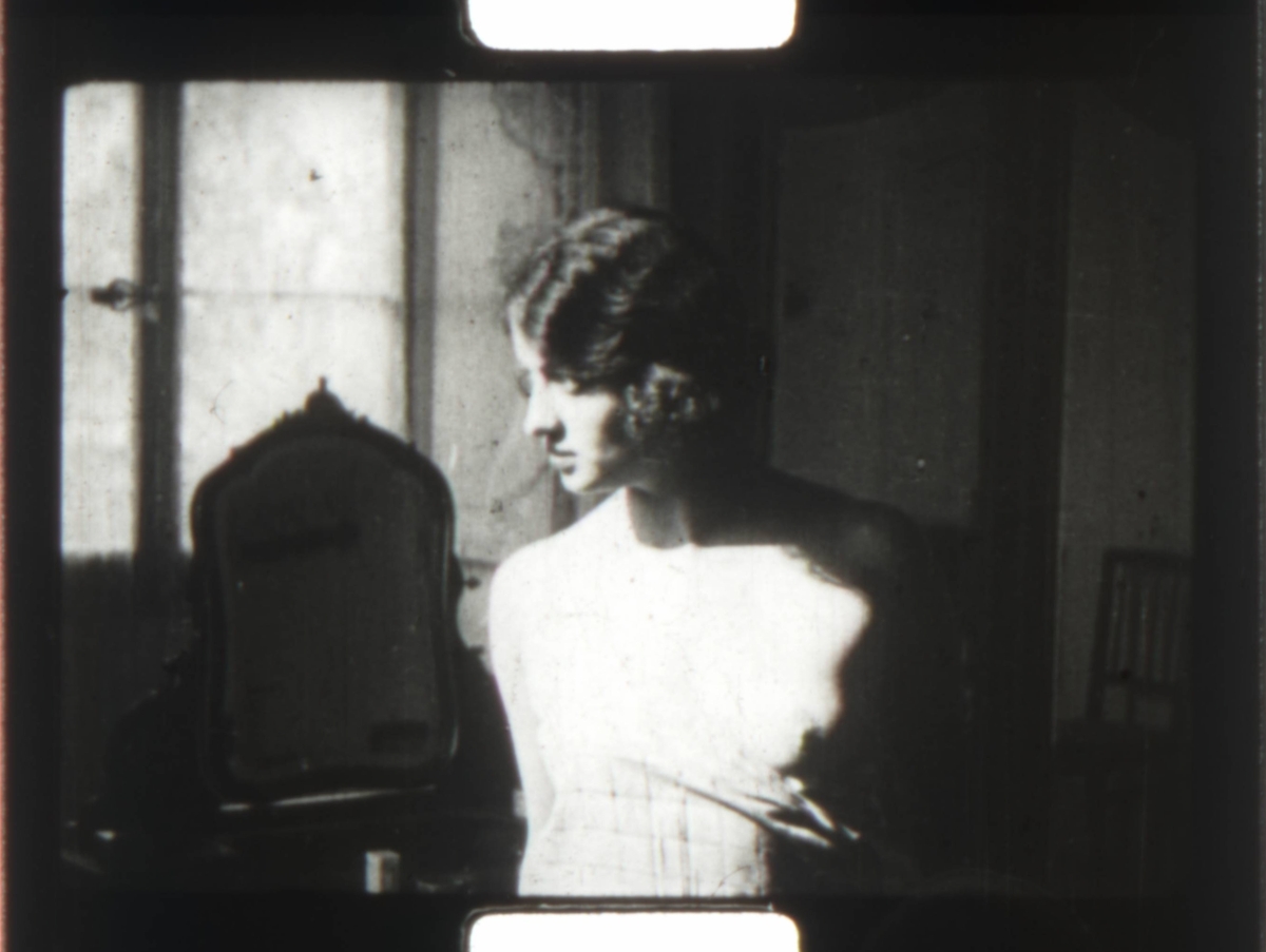 9.5mm、10m(約1分20秒)。登場人物は女性一人のみ。冒頭は浴室で体を拭いている姿でバスローブを羽織って部屋に戻っていきます。大きなベッドには開いたままのトランクケース。壁には大きな楕円の鏡が掛かっていて花瓶の花が映っています。女性はバスローブを足元に落とし、カメラに背を向けたままパジャマに着替え始めます。腰ひもを結ぶと身を反転してカメラを直視。
