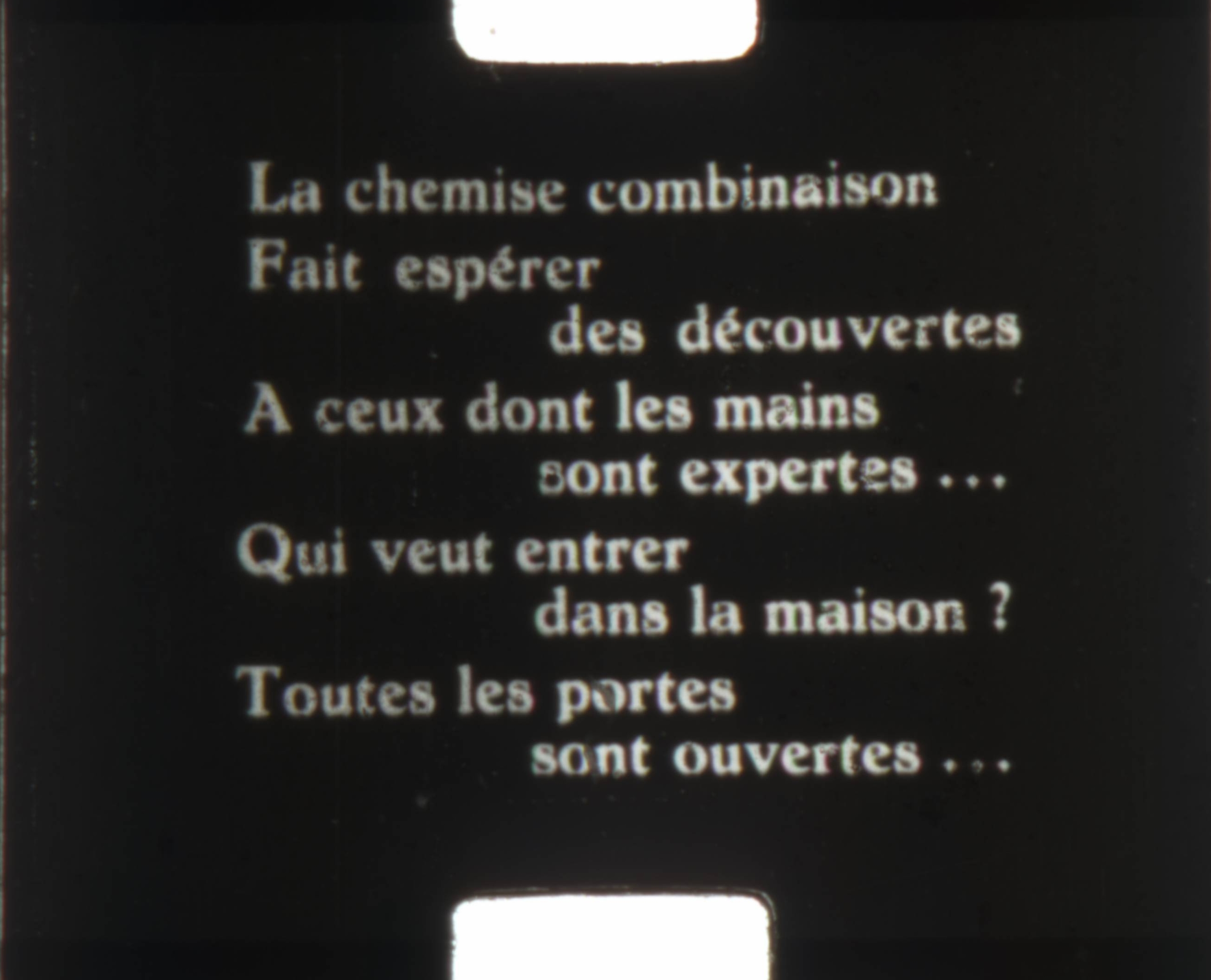無声ポルノ動画としては異例と呼べる長さですが、どちらも脚韻を踏んだ韻文詩になっています。上の字幕では4行の末尾がABABで韻を踏み(-clos, -ore, -clos, -ore)、下の例ではABBAB(-aison, -ertes, -ertes, -aison, -ertes)の形になっています。