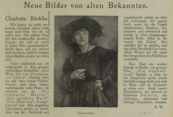 1918年、デクラ社の大作『劫罰への道』のヒロインに抜擢され注目を浴びたのがシャルロッテ・ベックリンでした。バイエルン映画社の劇映画(『黄金の書』『オカリナ』)で重要な役を務めていきます。目つき、表情にやや翳があり悲劇調の作品のヒロイン役として重宝され、また喜劇にも長けるなど万能型な演技力の持ち主とされています。