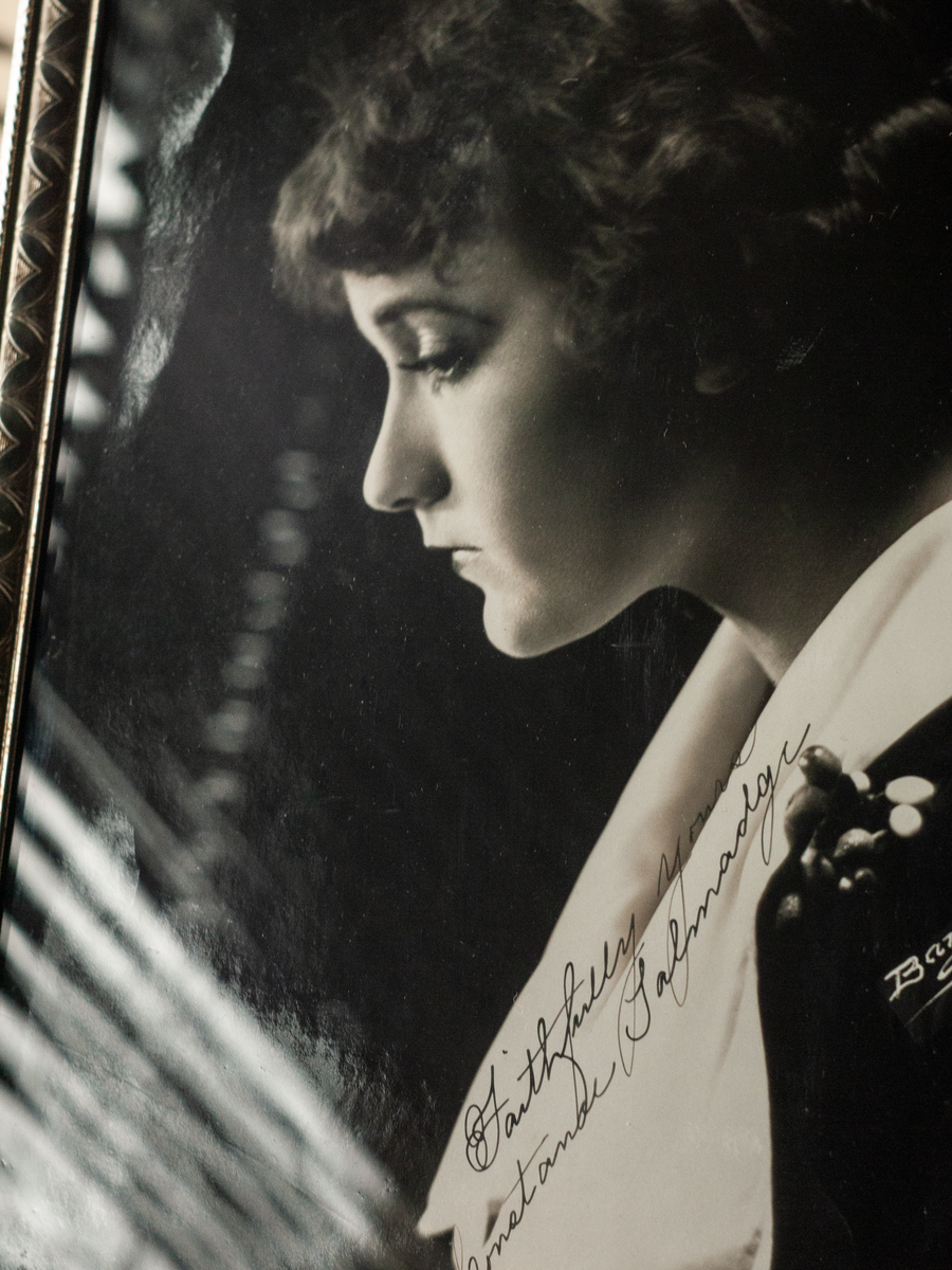 写真は万年筆のサイン入り。裏面に「セルズニック映畫社の新進花形 コンスタンス・タルマッジ」のスタンプが押されています。