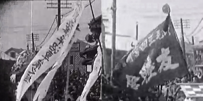 こちらの動画には幾つかの日本語が見て取れます。右手に「たばこ」の看板。花車に書かれた文字も読めそうです。