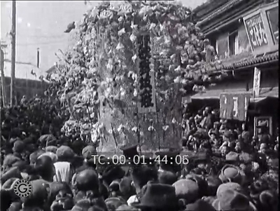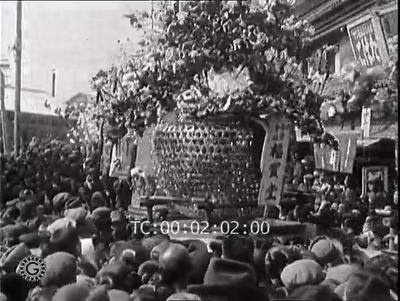 御輿に担がれ、大勢の見物人をかき分けてやってきた大きな花車。道端の人々が大きく見上げています。1分44秒前後に登場したのが「歌舞伎座」でした。その上には右から左に「東京」と書かれています。東京歌舞伎座が花車を出していたようです。
