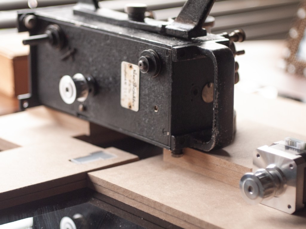 仮置きした状態。ステッピングモーターにも同サイズのタイミングプーリーを取り付けてあります。両者をベルト周50センチの歯付ゴムベルト(タイミングベルト)でつなげる予定です。
