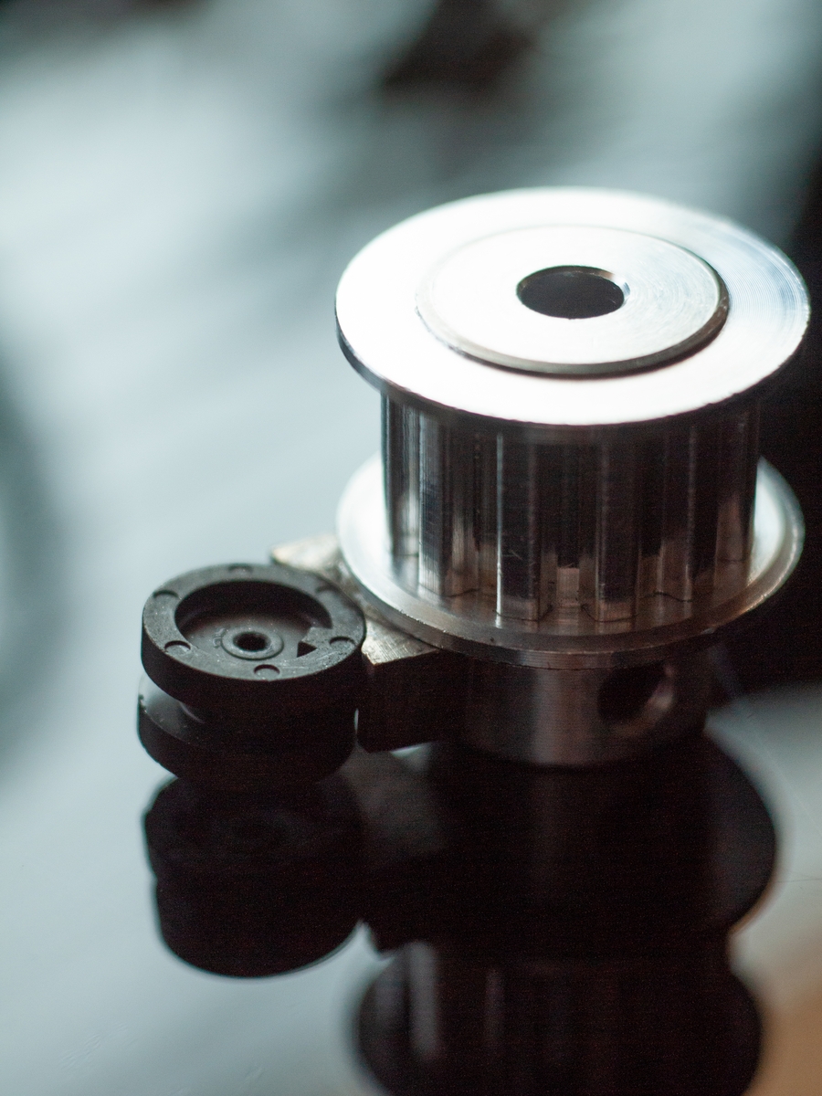映写機改造型では話が変わってきます。映写機の一部(ギア)とフィルムの位置が連動し、それにあわせて「シャッターを押すタイミングが決まる」訳です。そのため何らかの形で映写機/ギアに連動した物理的な「撮影トリガー」を組みこむ必要が出てきます。