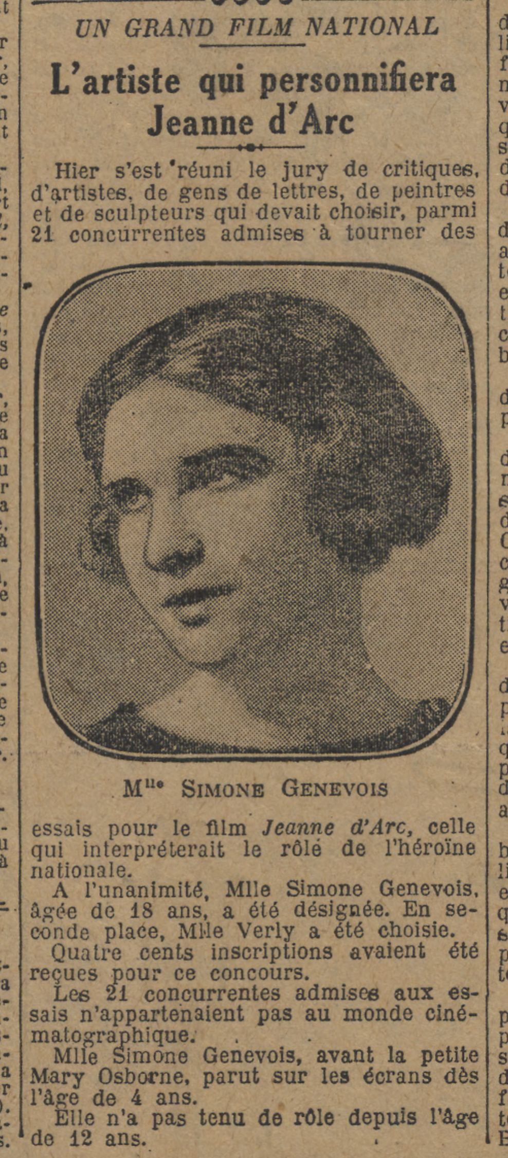 上の新聞記事は1927年6月に主演オーディションの結果が発表された時の物です。最終選考に残った22人の中からジュヌヴォワが満場一致で選ばれた、との内容。ただし一説では元々主演の条件を満たしていなかった彼女を俳優フィリップ・エリアが監督に強く推して選ばれたとされています。また1927年7月31日のレコー・ダルジェ紙には当時まだ未成年だったジュヌヴォワの契約を巡り周囲の大人の間でトラブルのあった話が触れられています。この手のドロドロした話題は映画雑誌では触れられないのが常でしたが、見えない所で色々あるのは今も昔も変わらない訳です。