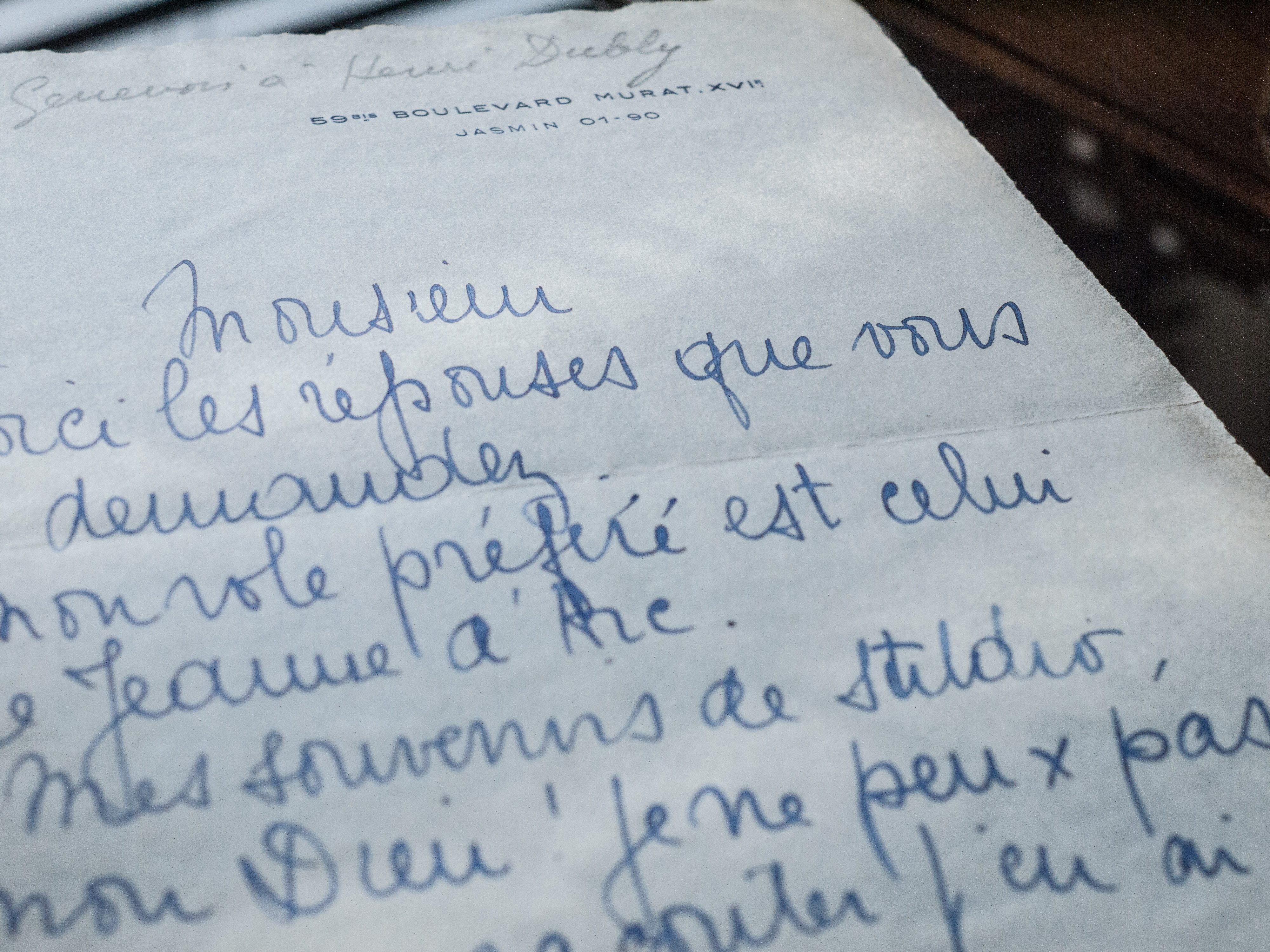 1930年頃と思われるシモーヌ・ジュヌヴォワ直筆の書簡。アンリ・デュブリ氏に宛てた物でサイズは19.2×30.2センチ。雑誌アンケートに回答する内容となっています。