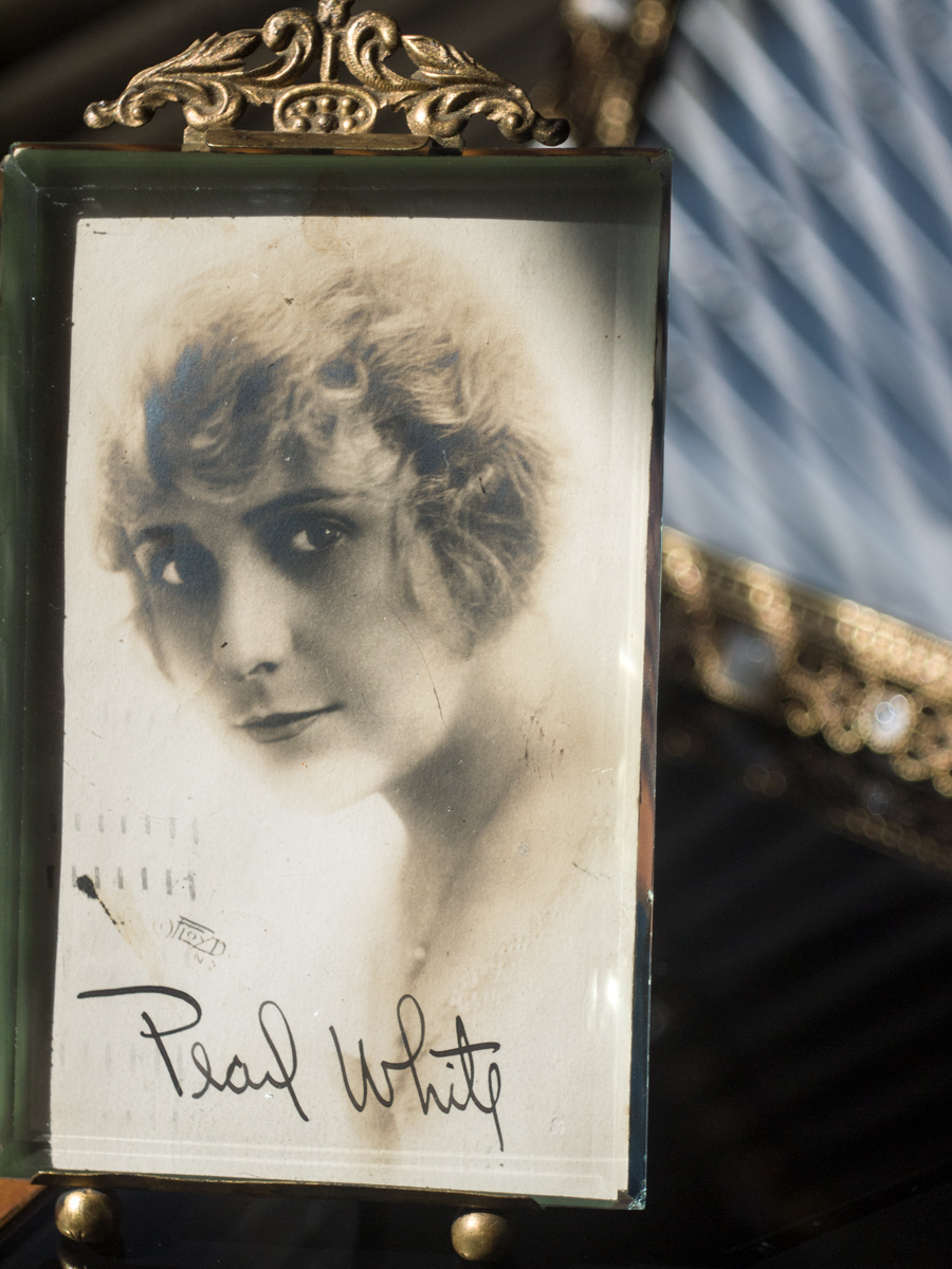 1917年公開の『運命の指環』宣伝用写真。乗馬服姿で鞭を持って毛皮に立っています。縁に数か所ダメージあり。左下には万年筆で「ミルドレッド・メイソンさんへ(To Mildred Mason)、パール・ホワイトより」の一文。ちょうど1910年代の半ば、ルービン映画社(Lubin Company)で短編アクション映画の脚本を担当していた女性に同名の方がおられます。