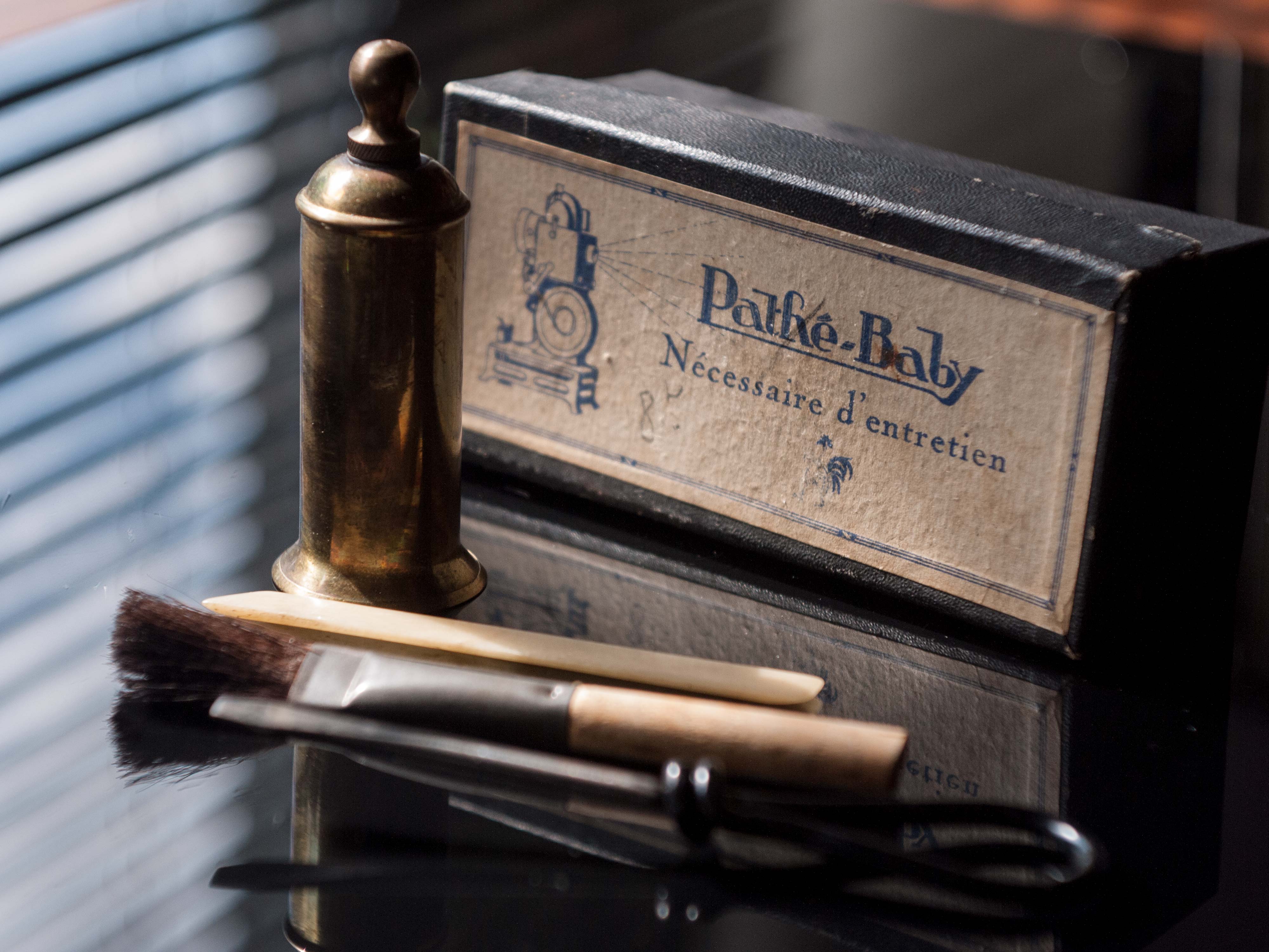 仏パテ社 パテベビー映写機 メンテナンスキット 投稿日: 2020-01-252024-05-06 投稿者: Hans Egede 1920年代 パテベビー映写機メンテナンスキット[/caption]パテベビー映写機のクリーニングやメンテナンスに必要な道具一式をまとめたもの。 1)マイナスドライバー 2)埃を除去ための筆 3)シャモア革のクロス 4)真鍮製のオイル差し 5)象牙製と思われるヘラ 5つの道具が含まれています(クロスは箱にしまったまま)。当初は紙製の箱入りで後に金属製の缶入りに変更されました。パテ社の製品カタログではカタログ番号F20が振られています(価格は15旧フラン)。 共有する クリックして X で共有 (新しいウィンドウで開きます) X Facebook で共有するにはクリックしてください (新しいウィンドウで開きます) Facebook