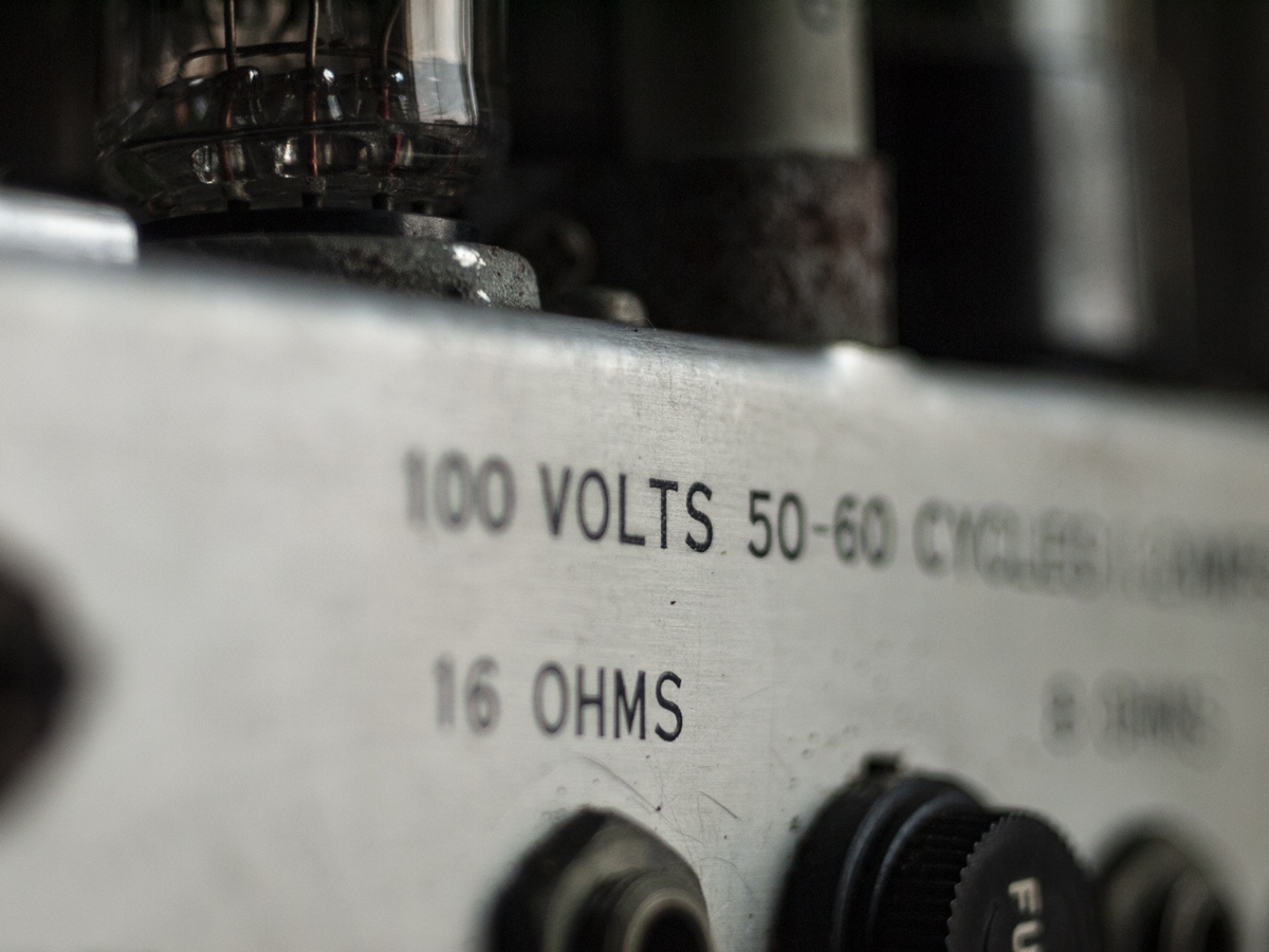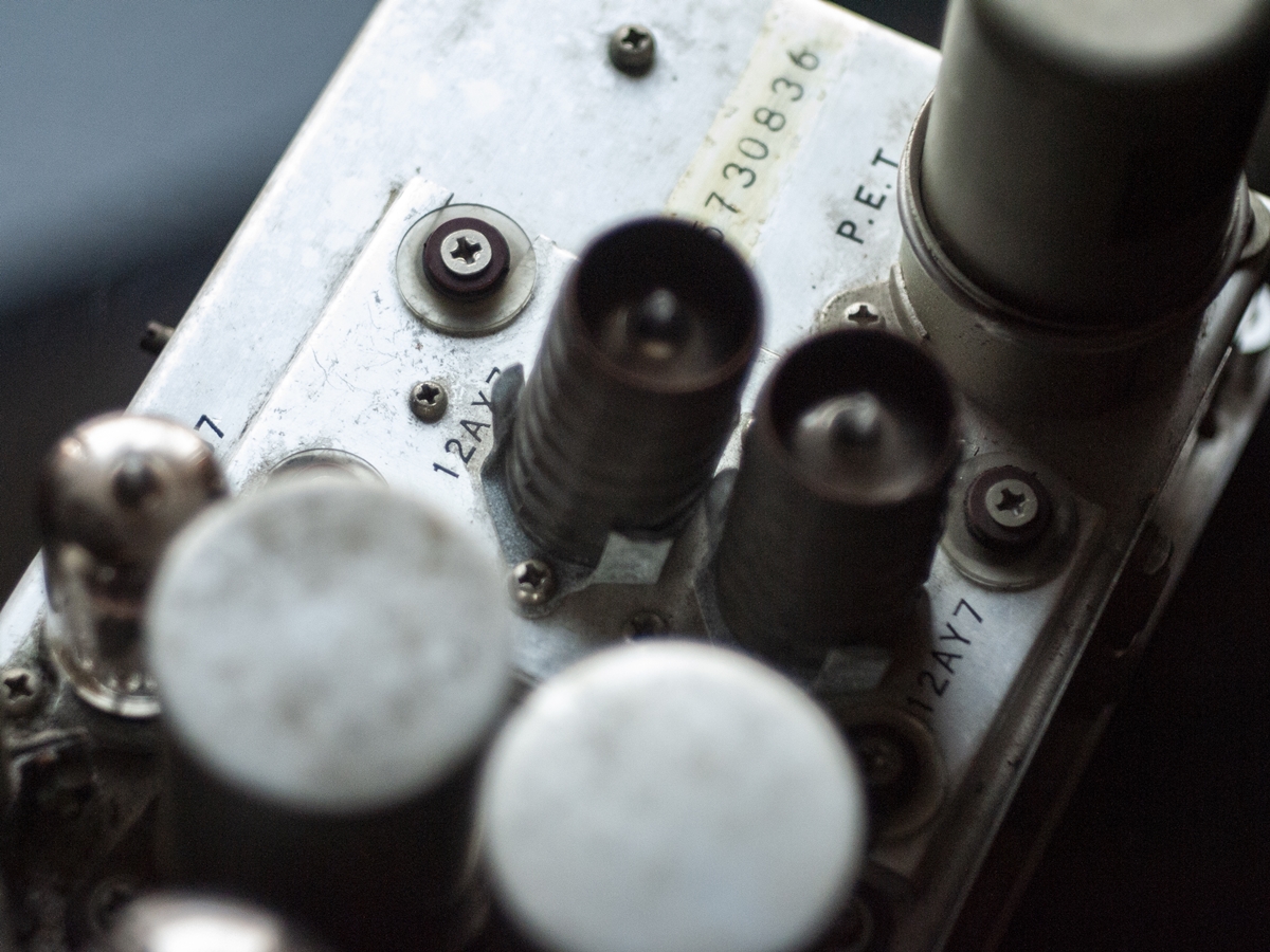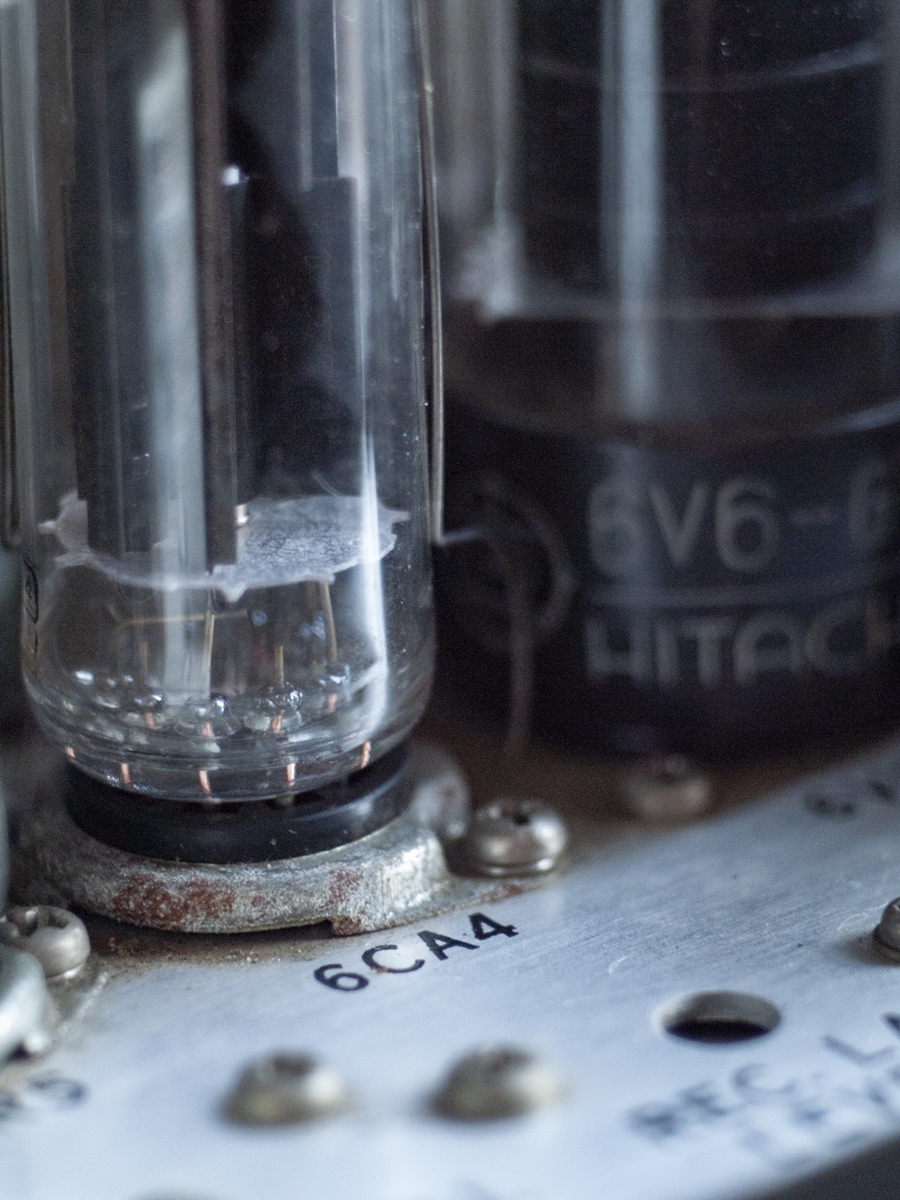 302/7302型のアンプは光学/磁気サウンド両方に対応した特殊モデルだったため385のアンプと構成が違います。385型アンプでは本体左上に変圧器が置かれていましたが、302型ではスペースがなかったため映写機ケースの内側に固定されています。また整流管用に6CA4真空管を採用していますが。385型アンプでは5Y3gtが使用されていました。ギターアンプとして使用する際に音の立ち上がりに違いが出てくるようです。トレブルとベースのつまみが独立して動くのも個性になっている模様。