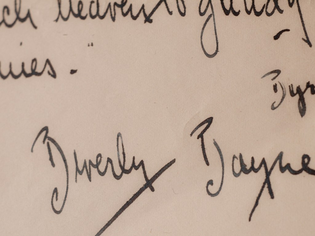 こちらは彼女がシカゴ市のアンバサダー・ホテルの便箋に書き残した直筆メッセージです。内容はバイロンの詩「かのひとは美しくいく」(She Walks in Beauty)の第一節を写したもの。