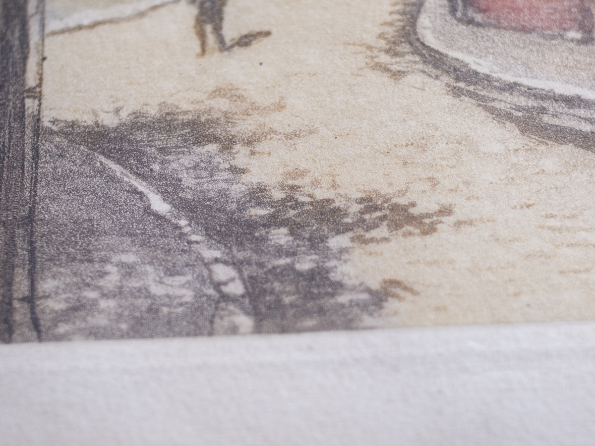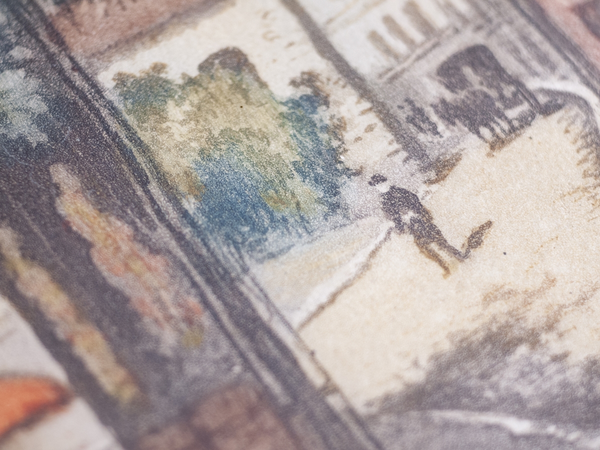 今回発見したのは監督としてのデビュー以前にトゥールヌールが残した多色刷りの水彩版画です。サイズは縦16×横22センチ、余白を含めると25×30センチ程になります。左上に作品名「テルトル広場(Place du Tertre)」、右下に同一筆跡で作者名(M Tourneur)の書きこみがあります。