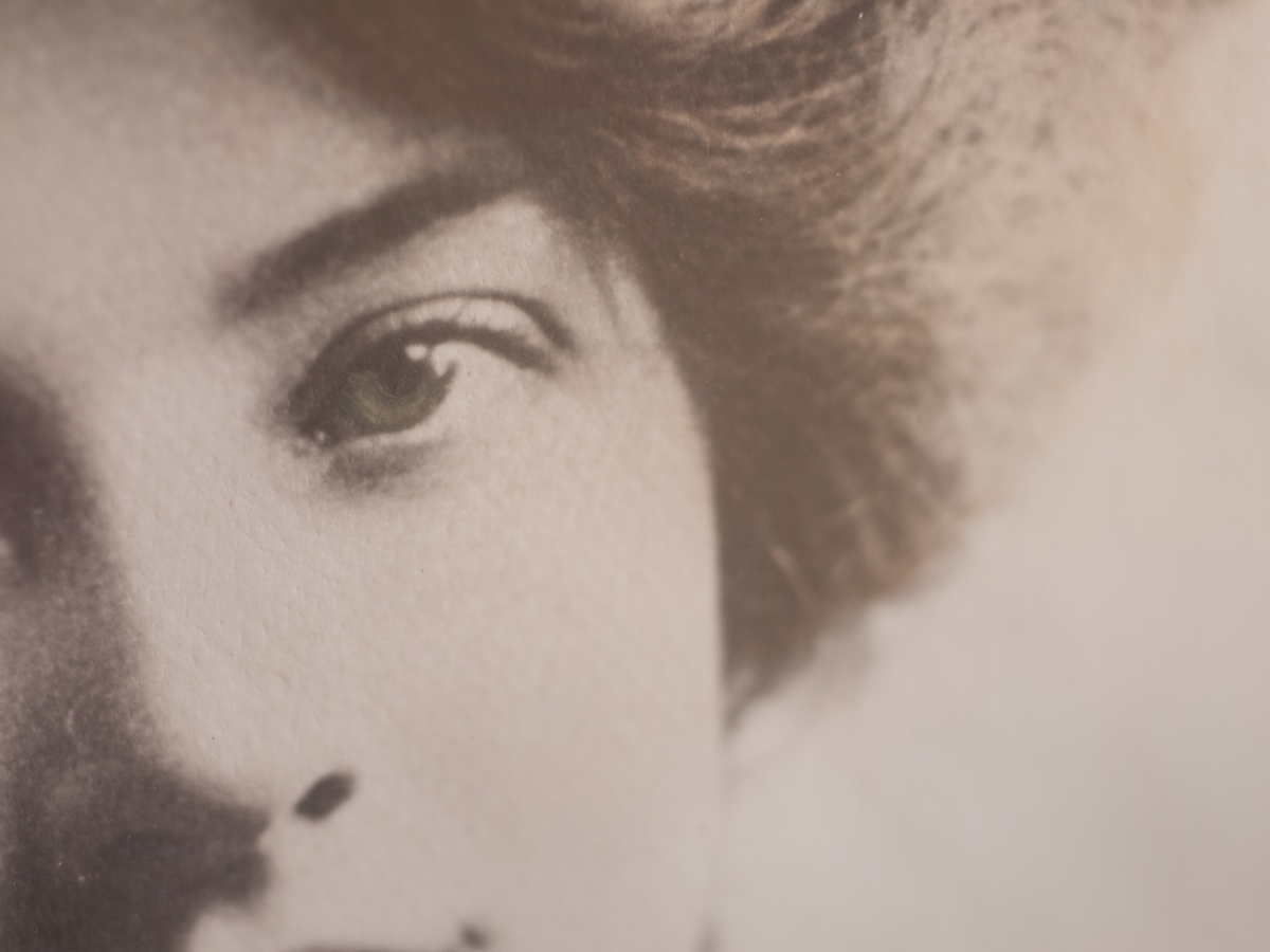 今回ご紹介するのはキャリア初期に撮影された写真です。額を含めると結構な大きさ(縦41×横37センチ)。裏側には「1904年頃撮影の手彩色生写真」の説明と飾ってあった場所(英マンチェスターのグレシャン通り)が明記されています。額縁はおそらく戦後のもので手彫りのしっかりした作り。
