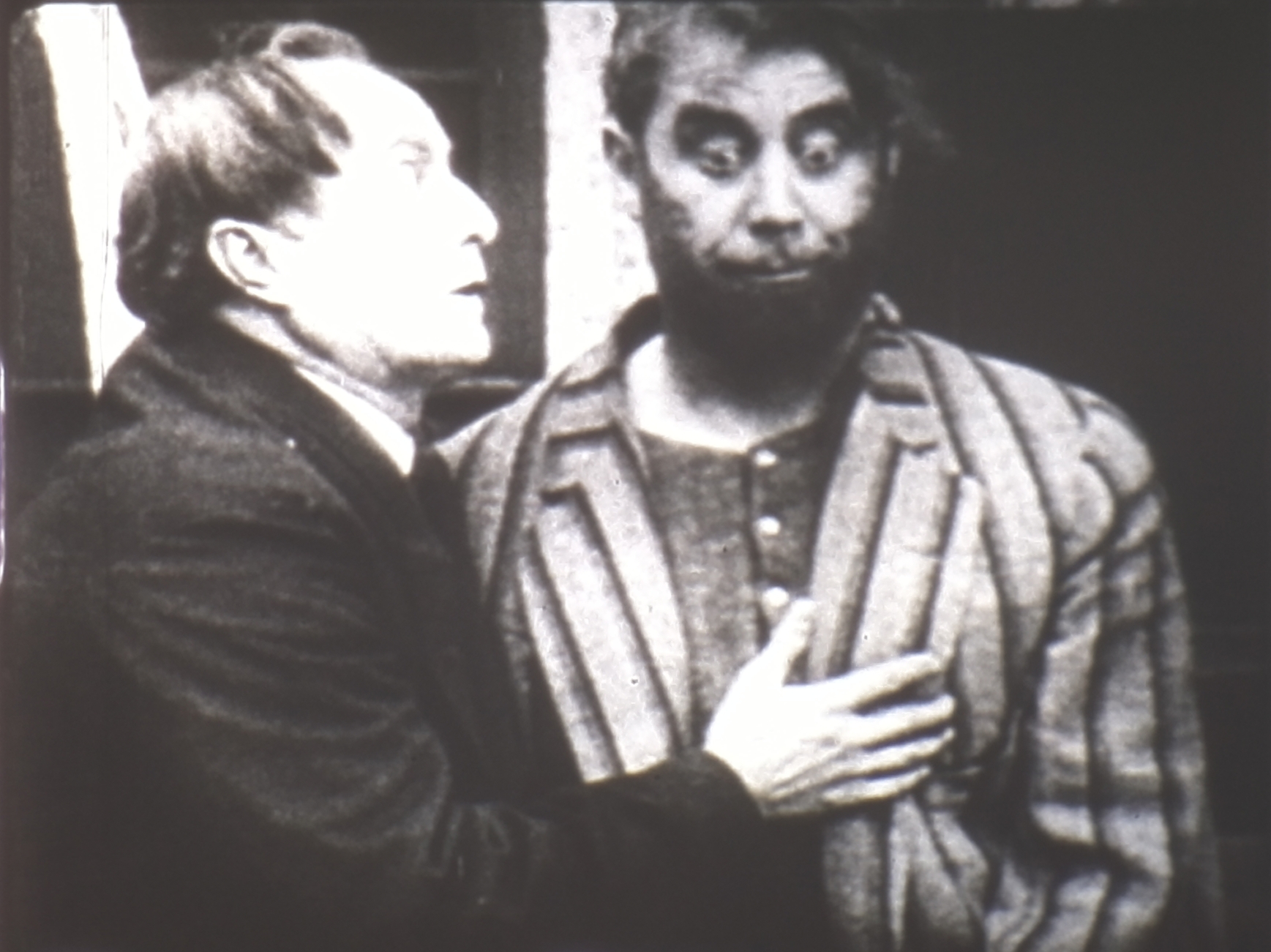 「チャップリンのバストショット」「エリック・キャンベルとの乱闘場面」も同様でAネガは右側のカメラで、Bネガは左側に置かれたカメラで撮影されています。キャンベルの背中にチャップリンが飛び乗る後者の場面は良く知られていますが、被写体と背景の位置関係がAネガとBネガで微かに違っており別カメラだと分かるのです。