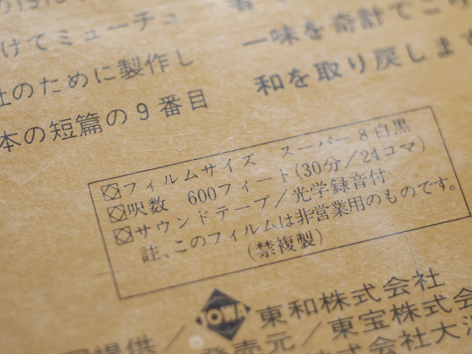 Super8、600フィート、30分(24fps)、白黒、光学録音(サウンドテープ付)、定価12,800円