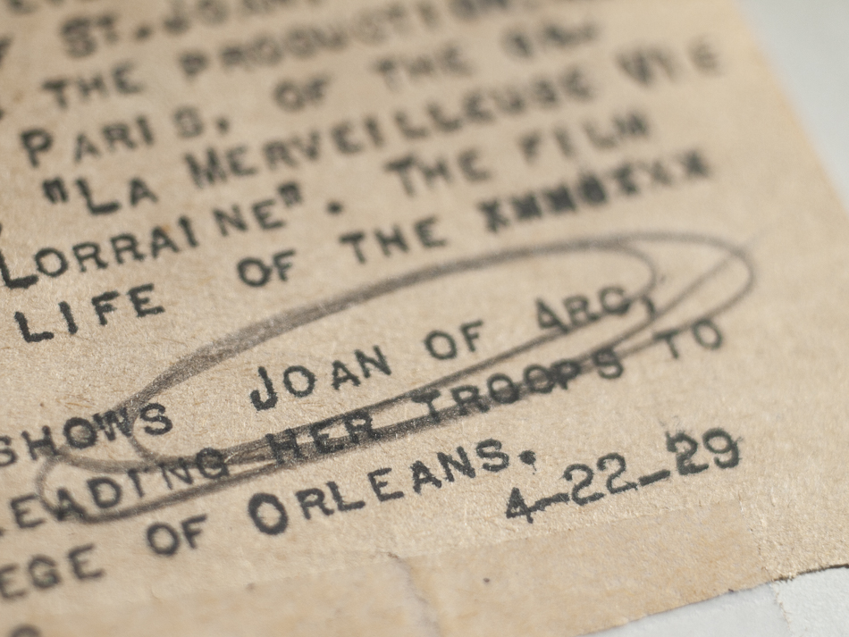 IMDbによると『ジャンヌ・ダルクの驚異の一生』の劇場公開は1929年11月1日。その半年前の4月18日にパリ・オペラ座でプレミア公開されており、4日後の4月22日に文章がタイプ打ちされ、5月22日に写真が準備された流れになっています。
