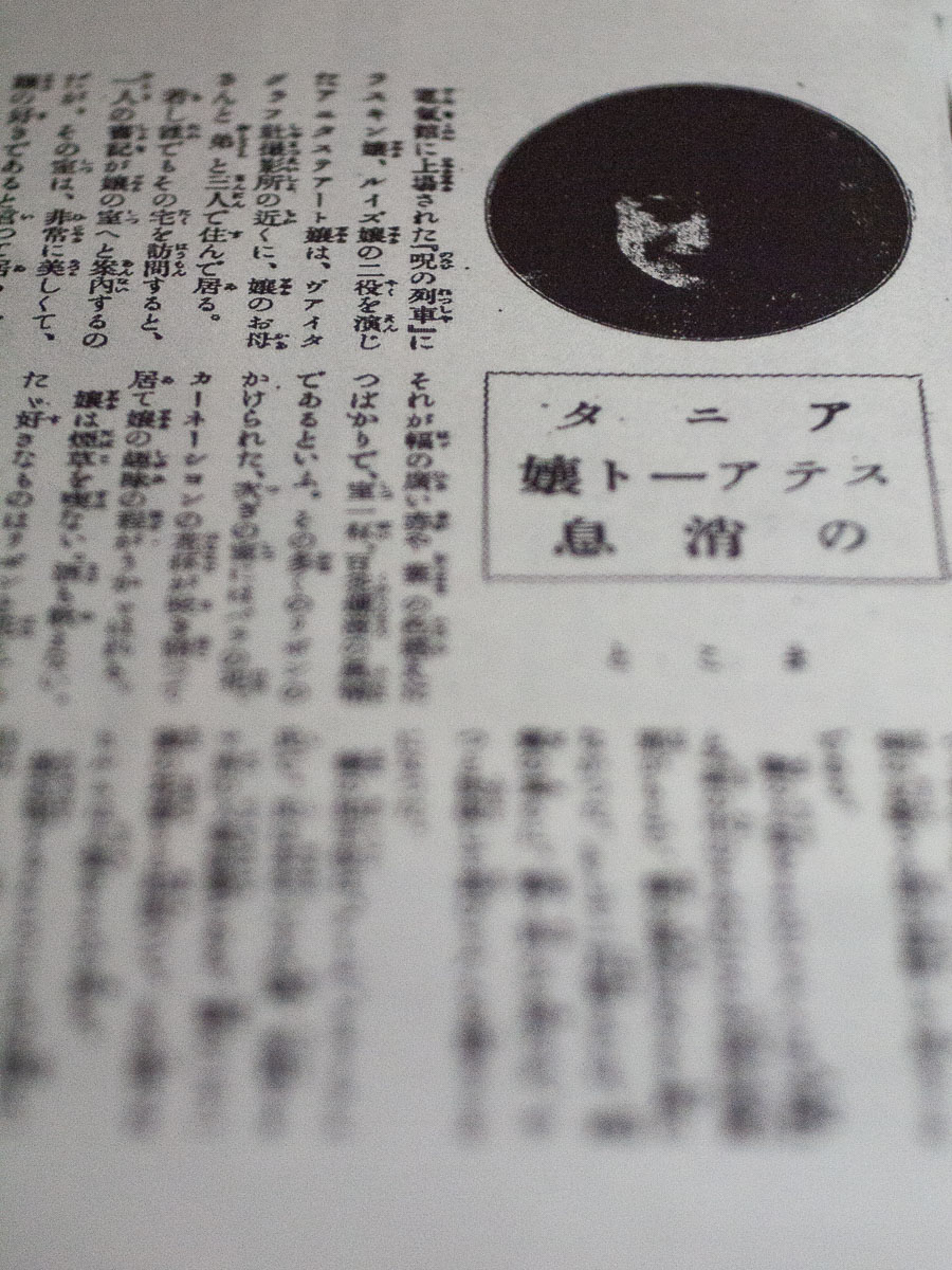 […] 嬢の人氣をよんだヒルムは『女神』と『森の中のすみれ』とで今春以來風邪がもとで、嬢の氣分はあまり勝れなかつた。そして一月前までは、病氣の爲に、暫く休んで居たが、やつと快復して再びヒルムを撮ることになつた。