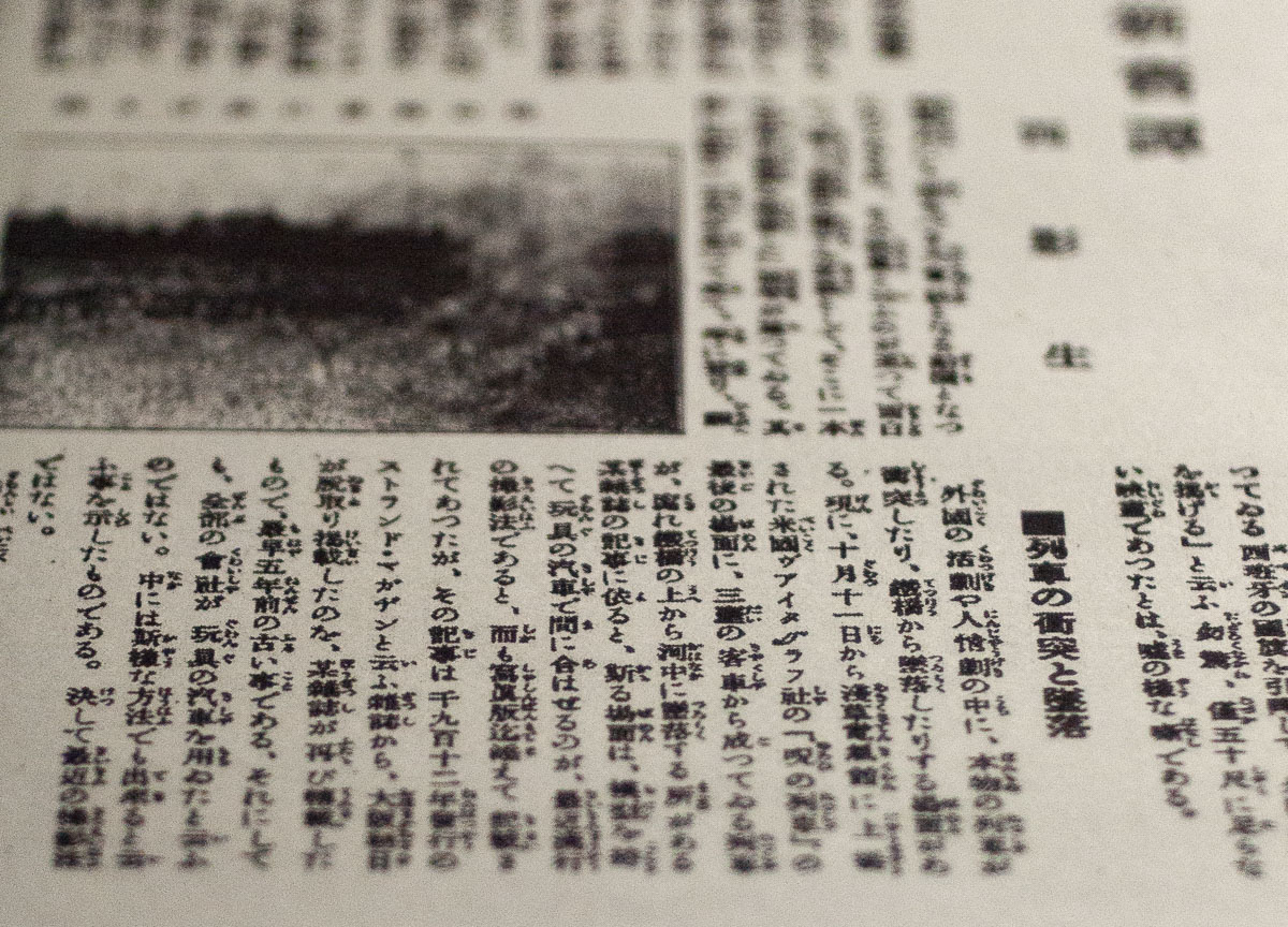 外國の活劇や人情劇の中に、本物の列車が衝突したり、鉄橋から墜落したりする場面がある。現に、十月十一日から淺草電氣館に上場された米國ヴアイタグラフ社の『呪の列車』の最後の場面に、三臺の客車から成つてゐる列車が、腐れ鐵橋の上から河中に墜落する所がある。