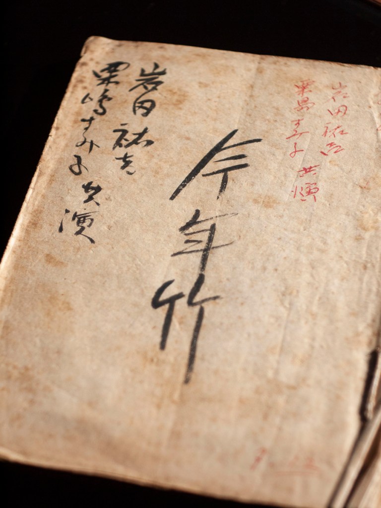 『今年竹』は昭和4年(1929年)に公開された松竹作品で岩田祐吉と栗島すみ子主演作。里見弴による同名小説を元にしたものです。こちらは全108頁の手書き台本(作品前半の5巻分)で当時の弁士が実使用した一冊と思われます。表紙は作品タイトルと主演俳優名のみ、見返しに出演者一覧。