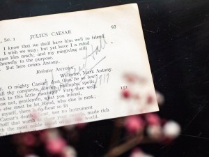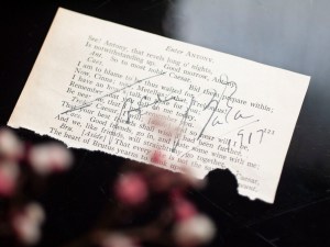 サインは2016年に入手。『シーザーの御代』(大正6年)の公開時、セダ・バラ(クレオパトラ役)とサーストン・ホール(アントニウス役)がシェークスピアの『ジュリアス・シーザー』の書籍ページの切れ端にサインを残したもの。頭文字「T」を書くとき万年筆の先端が紙に引っかかった跡があります。