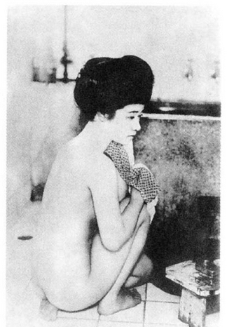 それから幾日か經つて、誰のいたづらか未だに分らないのであるが、彼女が風呂場で立膝をしながらあかすりを使つているところの、實に驚くべき大膽不敵な裸體姿の寫眞を、愚生に送つて來たのである。