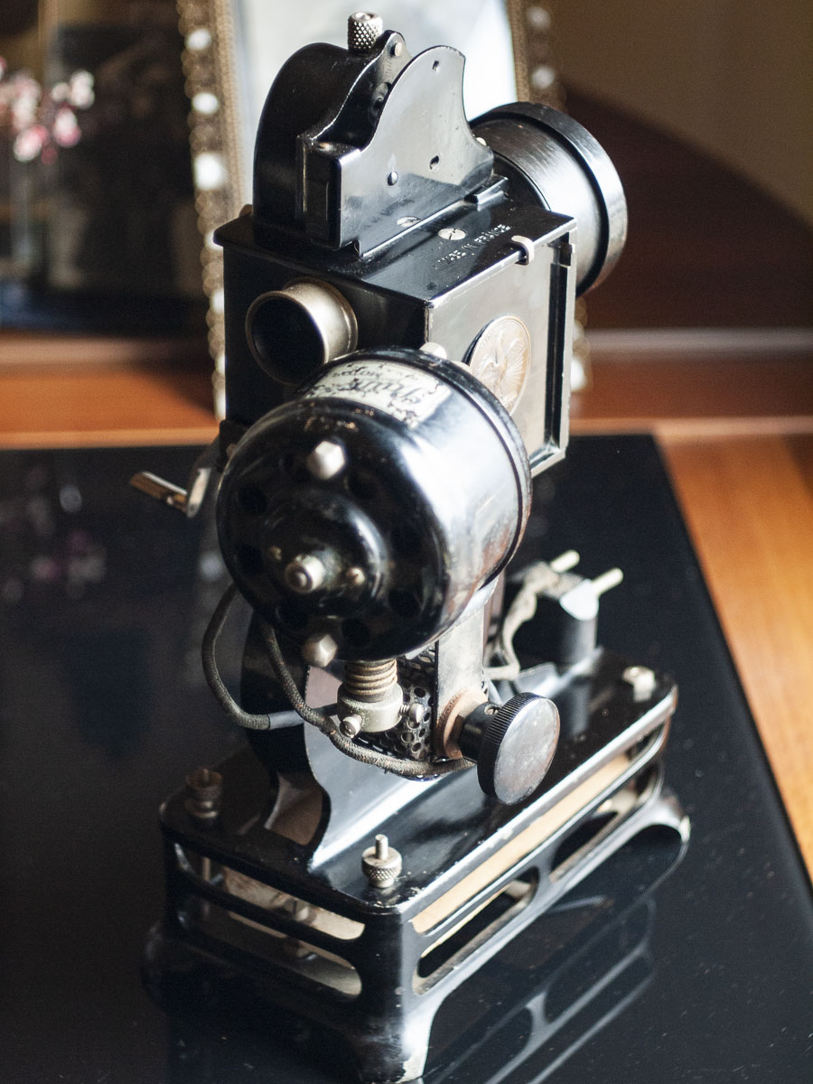 2013年に初めて入手したモーター付きのパテベビー映写機。仏パテ社が市販していたモーターは土台後部に設置しベルト2本で動力を伝えていくのですが、こちらの米国仕様は発想が異なっており本体側面に切りこみの穴をあけ、モーターで直接シャッターホイールを回す形になっています。2年程メイン機に使用。酷使したせいもあって2014年末に速度調整用の抵抗が焼き切れてしまいました。
