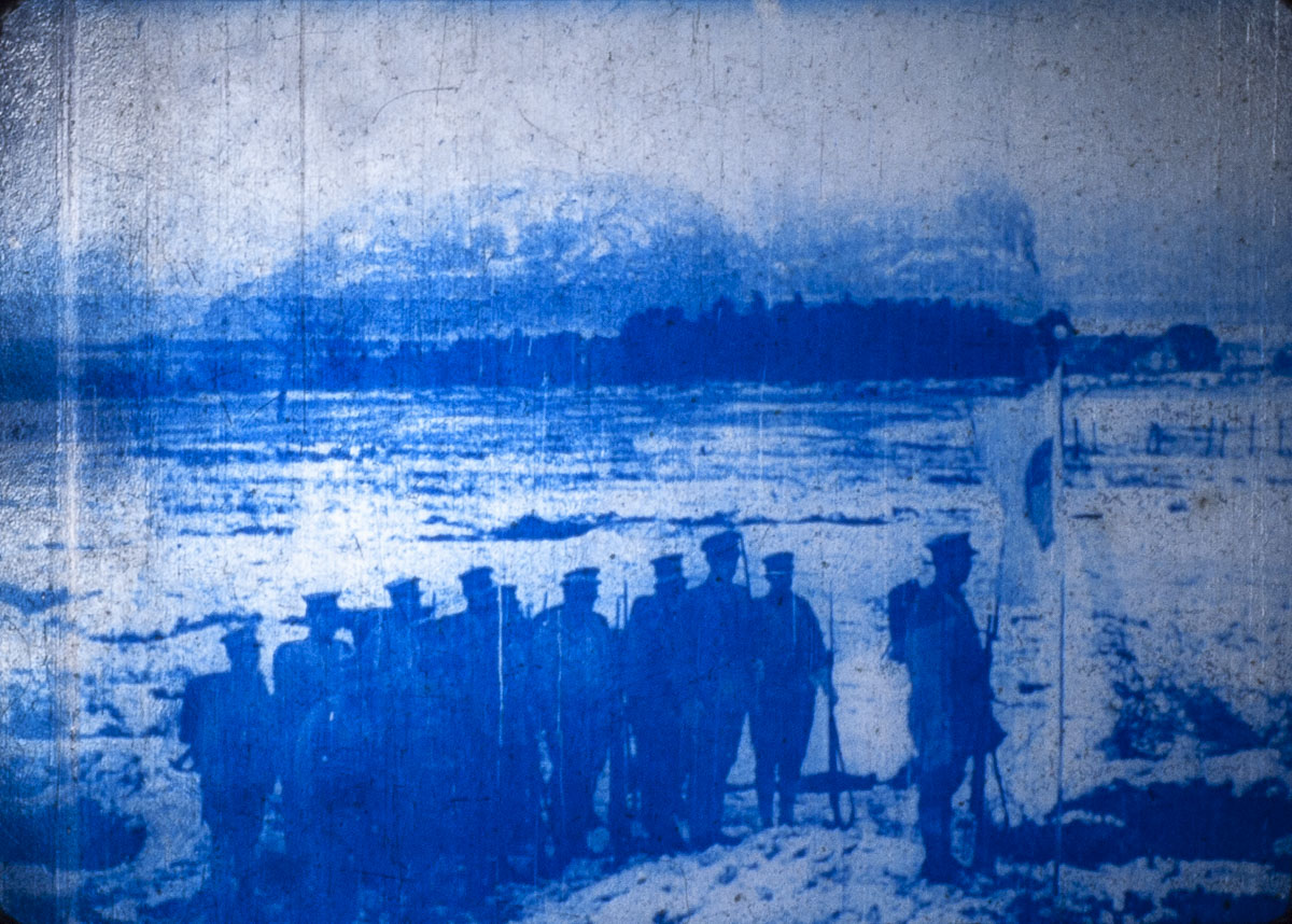 今回入手した35ミリ版は結末近い殉死場面のみの抜粋です。劇場公開版は7巻物の長編で女優陣(都賀静子、浅間昇子、小川雪子)の名もクレジットされており、大陸での戦闘場面だけではなく国内での家族や恋人との物語展開も含まれていたと思われます
