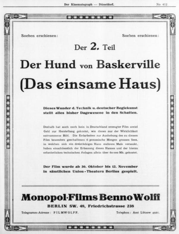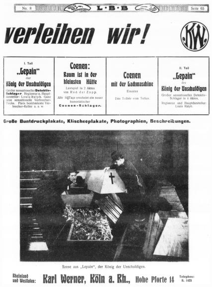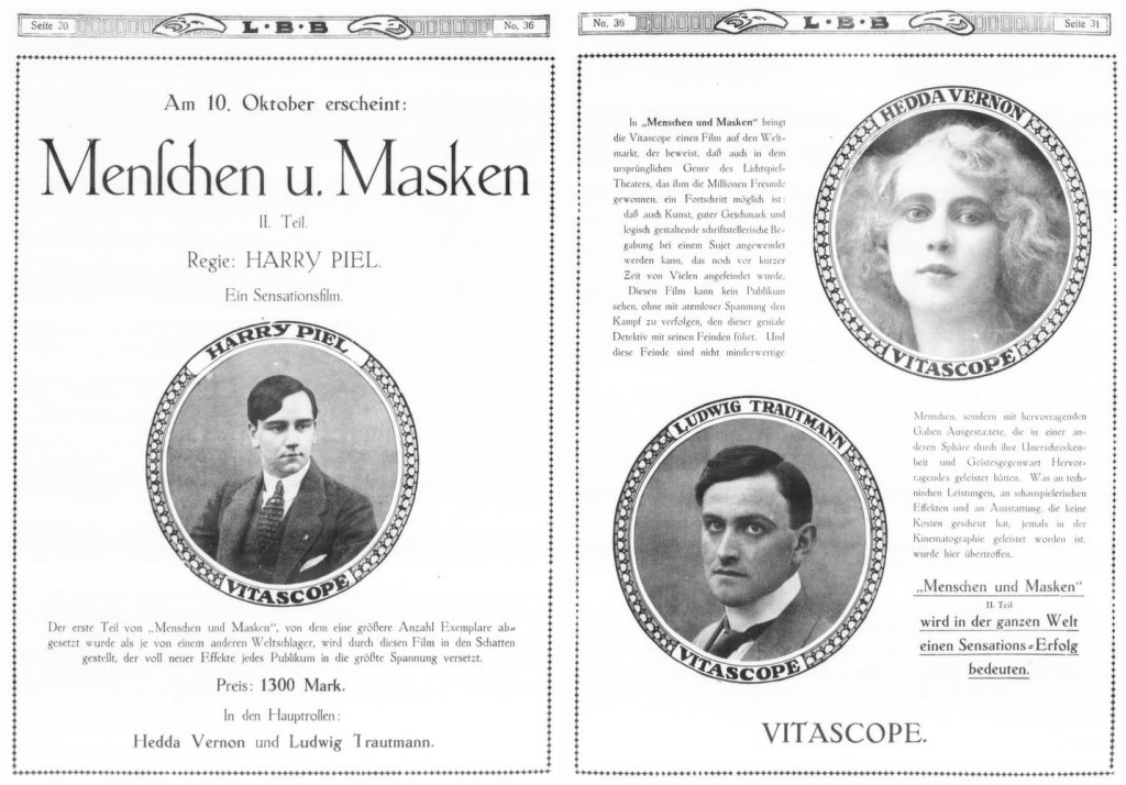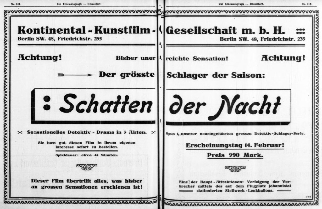 結構な数になりますが、本国ではこれでも序の口に過ぎなかったようです。戦中1916~17年にかけジョン・ディード探偵物、ハリー・ヒッグス探偵物、ウィリアム・カーン探偵物、ファントマス連作、ネモ博士連作、ジョー・ジェンキンス探偵物、トム・シャーク連作…20以上ものシリーズが制作され「探偵活劇のインフレ(die Inflation des Detektivfilms)」と形容される状況になっていきました。