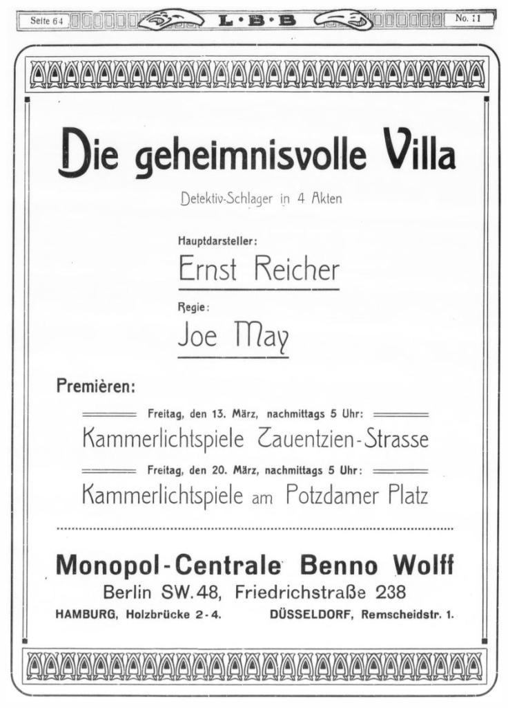 『地下室(不思議の別荘)』(Die Geheimnisvolle Villa) 1914年5月14日・帝國館