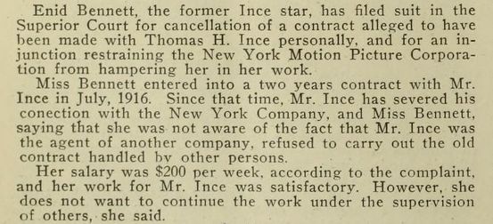インスとの出会いとそこからのサクセス・ストーリーは美談として語られがちです。実際のところ1917年中盤にエニッド・ベネット側がインスを訴えた出来事もありました。インスの直接プロデュース以外の作品にも出演しなくてはならない契約内容に不満があり、最終的には元鞘に収まって一件落着。