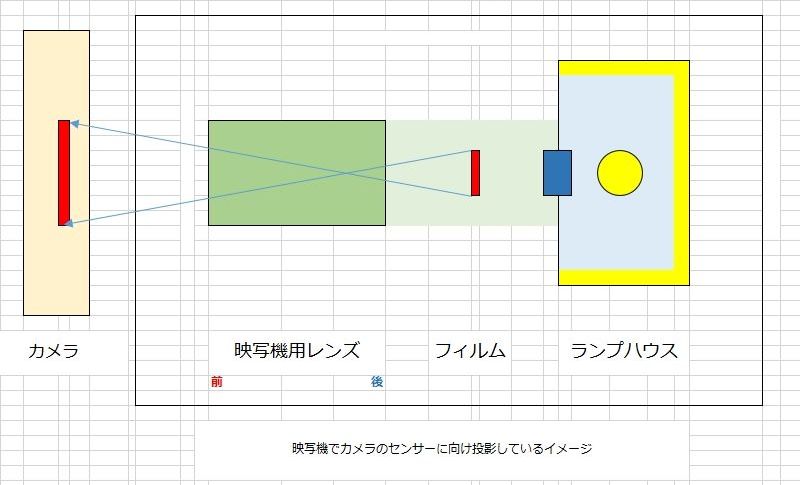 センサー~レンズ~フィルム~光源までの並びは同一。映写機で投影した画像をセンサーで取りこむ前者と光で照らされたフィルムをカメラで撮影する後者は発想こそ異なっているものの物理・光学的には同じことをしている話になるのです。
