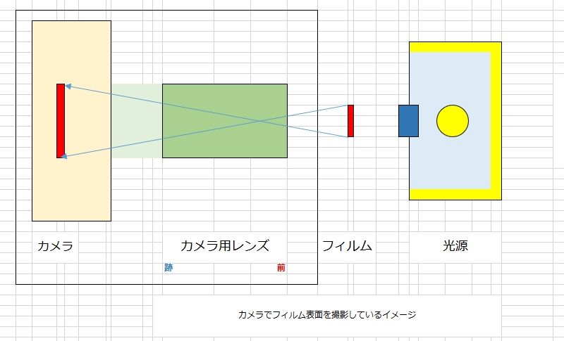 一方、映画フィルム用のスキャナーは照らし出されたフィルムをセンサーとレンズをセットにした「カメラ」で撮影するという発想になっています。