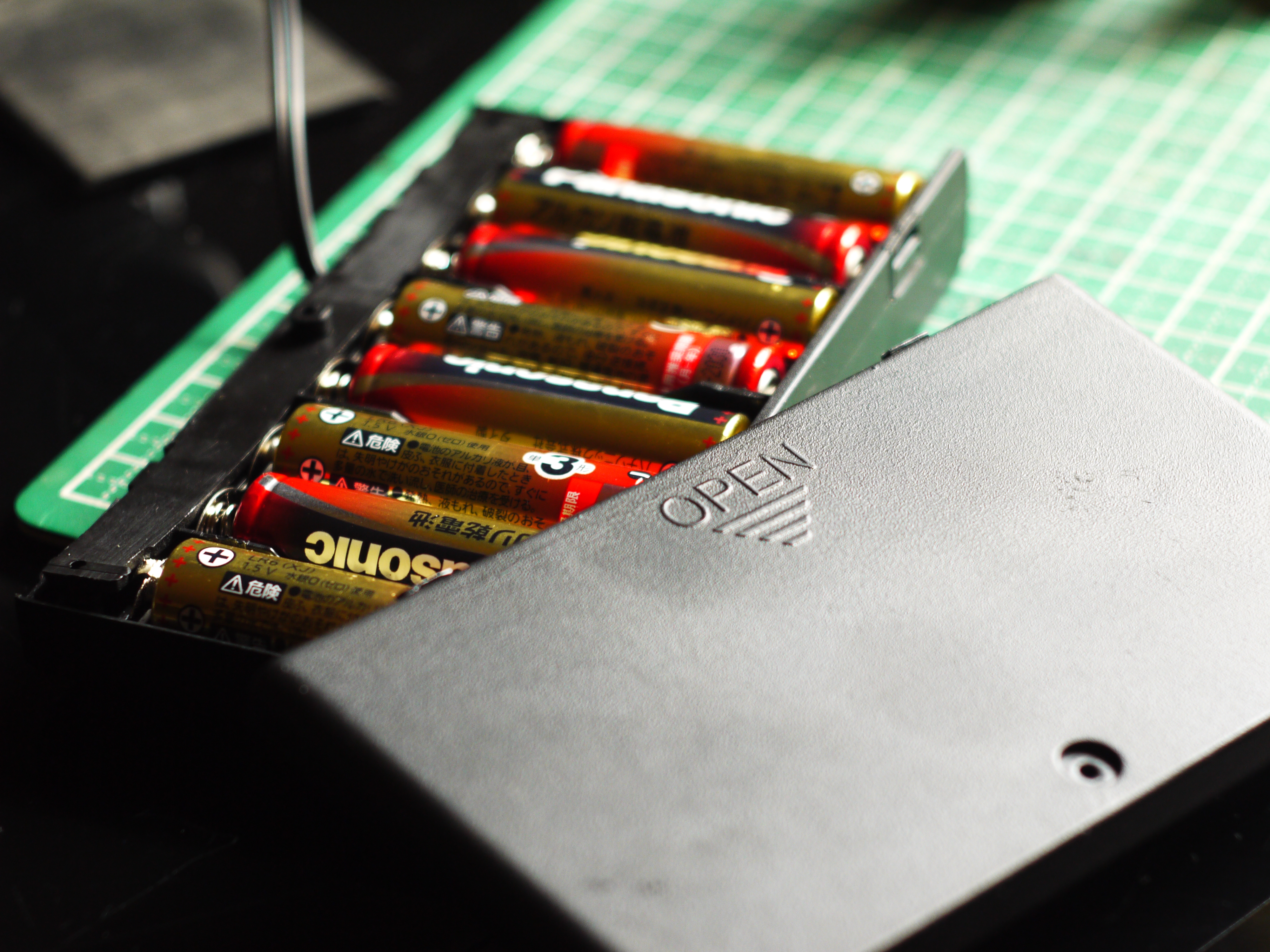 このフィルムホルダーをセットする仕組みを作っていきます。複数の樹脂パーツを組みあわせたもので、四角い箱型の部分がランプハウスとなっており、1)LED電球、2)背面の光を反射させるお椀型のミラー、3)パテベビー映写機から取り出したコンデンサーをはめこんでいます。LEDの電圧が12Vだったので単三電池8本を外付けにして電力を供給します。