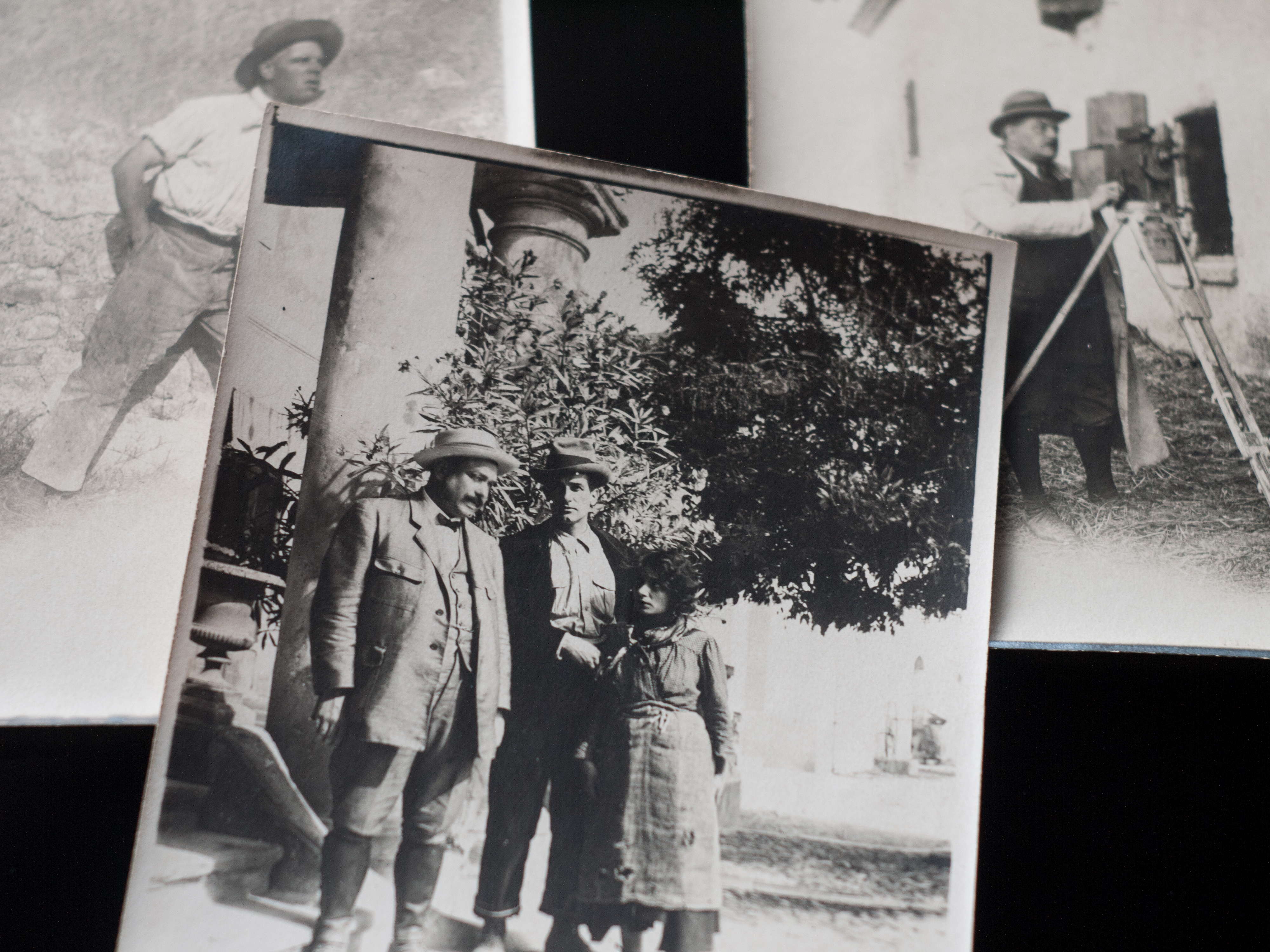 第一次大戦終戦の大正7年(1918年)に撮影され、翌8年(1919年)に公開された劇作品『ぶどう月』撮影中の写真三点。販促用スチルではなく、撮影関係者が内々のやりとりで保管していたオフショットで、ここにある以外現存していない資料と思われます。