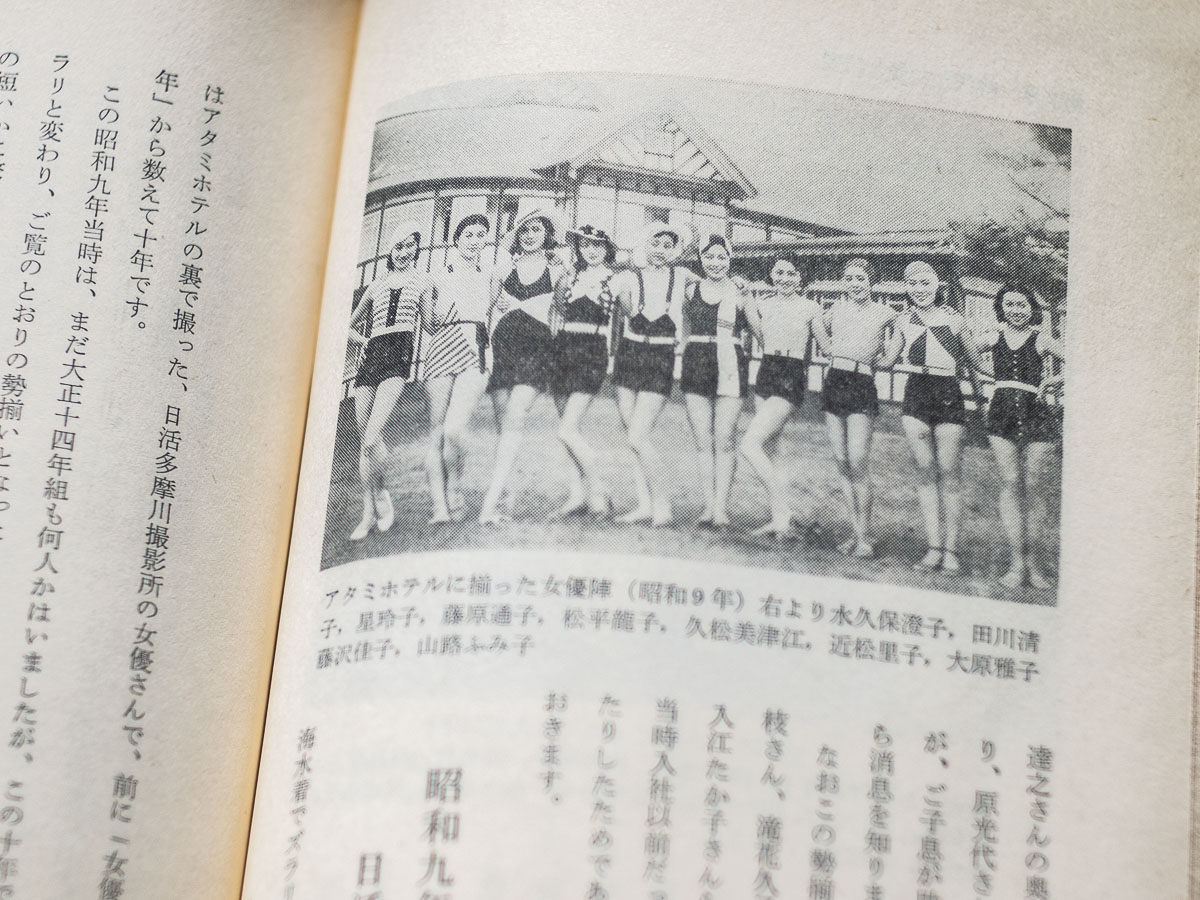 本サイトで『髪と女優』を最初に引用したのは「大正14年の日活俳優揃え」。同書にはもう一点「昭和9年の日活女優揃え」の写真も掲載されています。星玲子、久松美津江、近松里子など30年代中旬の多摩川撮影所女優がアタミホテル裏で撮影した水着姿の集合写真で、それぞれの女優についてのコメントが情報の宝庫となっています。おそらくは「昭和4年の日活女優揃え」にも絡んでいるのではないかな、と。
