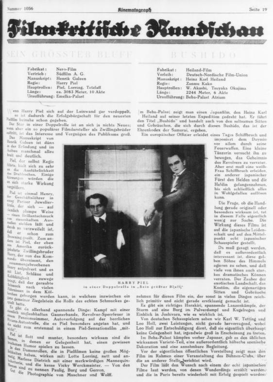 専門誌の様々な記事で伝えられているように、ハインツ・カール・ハイラント氏は日本で時代劇映画を作り上げた。日本の映画会社東亜キネマが共同で製作に当たった。監督は賀古残夢氏。主演はロー・ホール、カール・W・テティング、岡島艶子、明石潮の四氏。現時点でドイツ版が公開中。