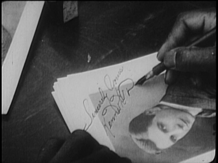 ハリウッドではこの慣習は比較的早くからあったようです。仏モーリス・トゥールヌールが渡米後に監督した初期作の一つ『ガールズ・フォリー』(1917年)には、西部劇映画のリハーサル撮影中、主演男優の付き人が楽屋でプロモ写真に代筆している場面が描かれています。