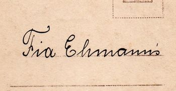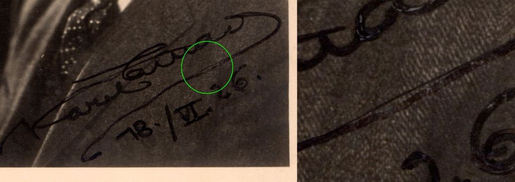 拡大し、名前の末尾から伸びた弓型の線を見てみます。右の拡大図を見ると細い線(上)と太い線(下)の二重線になっているのが分かるでしょうか。元々の絵葉書に黒文字の印刷サイン(細)があって、後年、誰かがそれをペンで上書きした(太)形になっているのです。