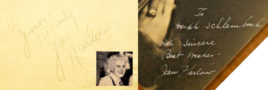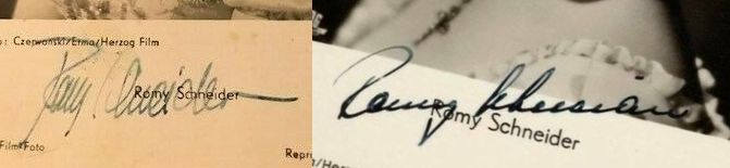 数としては少ないものの、代筆サインには会社由来とは質を違えたものが含まれています。何らかの理由で本人の家族がサインを代行したパターンです。有名な例がジーン・ハーロウとロミー・シュナイダー。いずれも女優の母親が代筆者となっており、とりわけジーン・ハーロウの場合は本人直筆はほとんど存在しないとされる位代筆の割合が高くなっています。