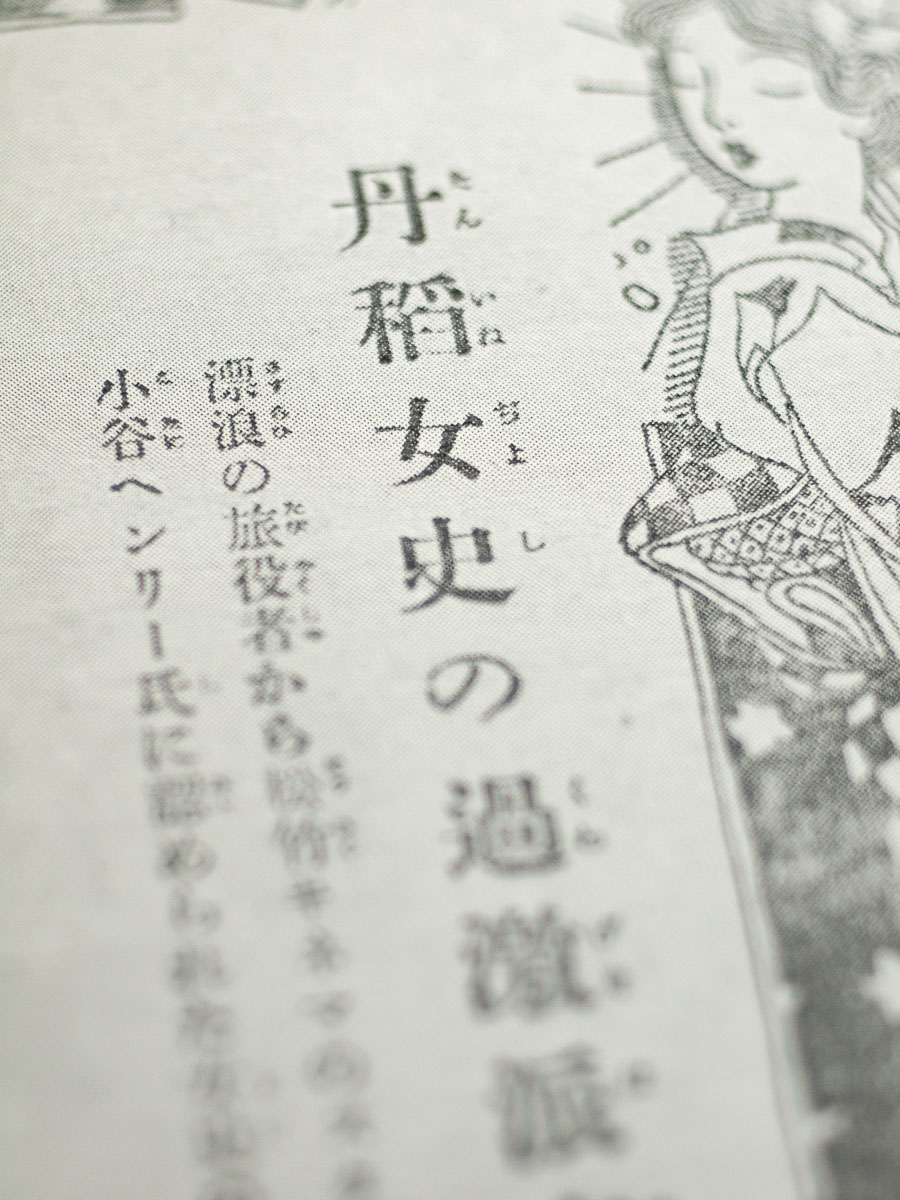 然し、この丹女史が、巧まざる自然の表情の表現家として、頗る有望な女優である事をこの時發見した人がある。それは、誰あらう松竹が年棒四萬圓で、米國からはるばる雇入れたヘンリー小谷某である。これは、丹を女主人公にして使つたら、定めし面白いアメリカ式の寫眞が出來るだらうと考案して、早速それに向く脚本の撰定にと掛つた。で、漸く女労働者がストライキの大將になると云ふ頗る丹稲向きの物が見附かつた。丹女史をその女主人公として、その撮影に取掛かつた。[…]