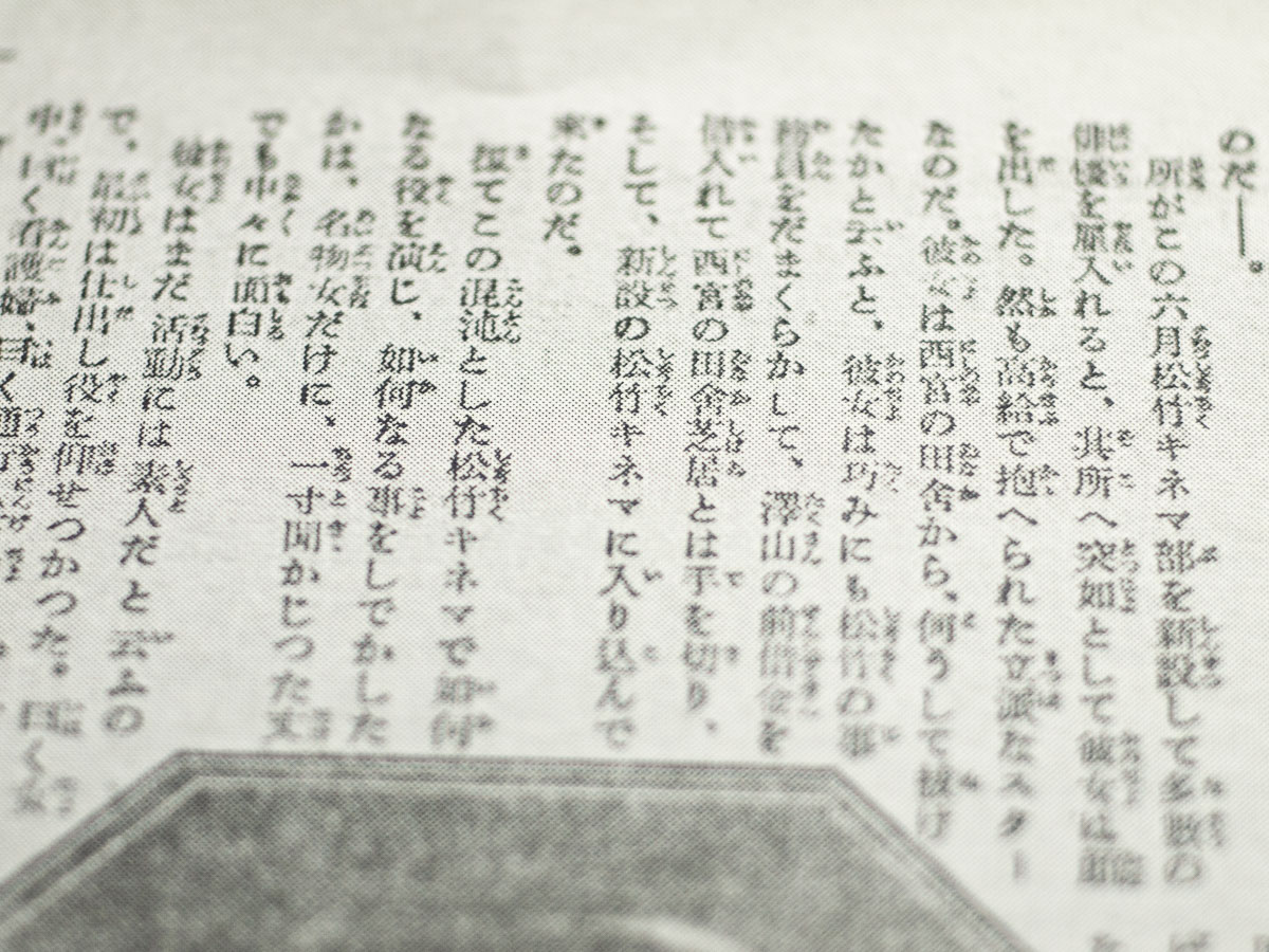 所がこの六月松竹キネマ部を新設して多數の俳優を雇入れると、其所へ突如として彼女は顔を出した。然も高給で抱へられた立派なスターなのだ。彼女は西宮の田舎から、何うして抜けたかと云ふと、彼女は巧みにも松竹の事務員をだまくらかして、澤山の前借金を借入れて西宮の田舎芝居とは手を切り、そして、新設の松竹キネマに入り込んで來たのだ。