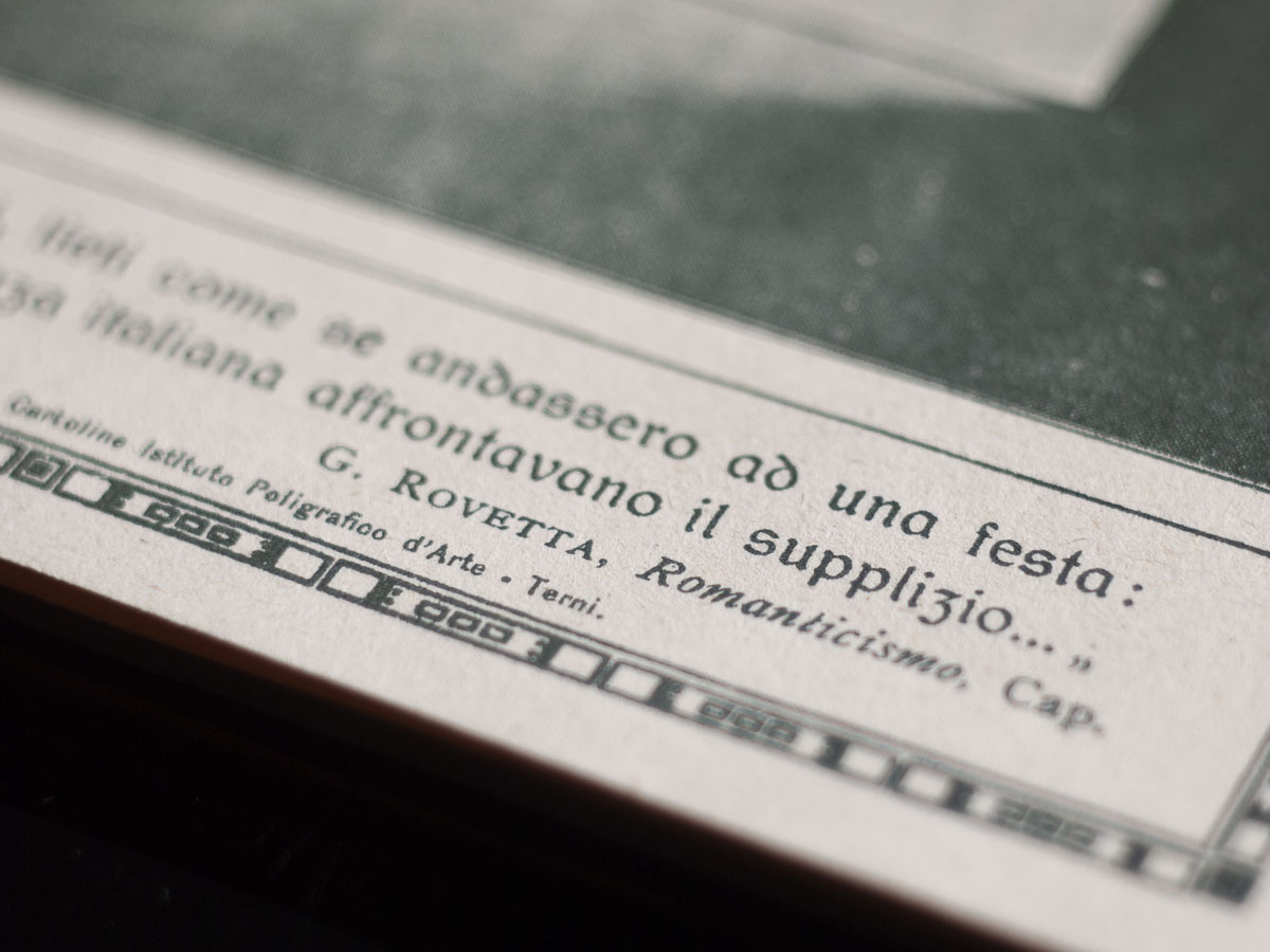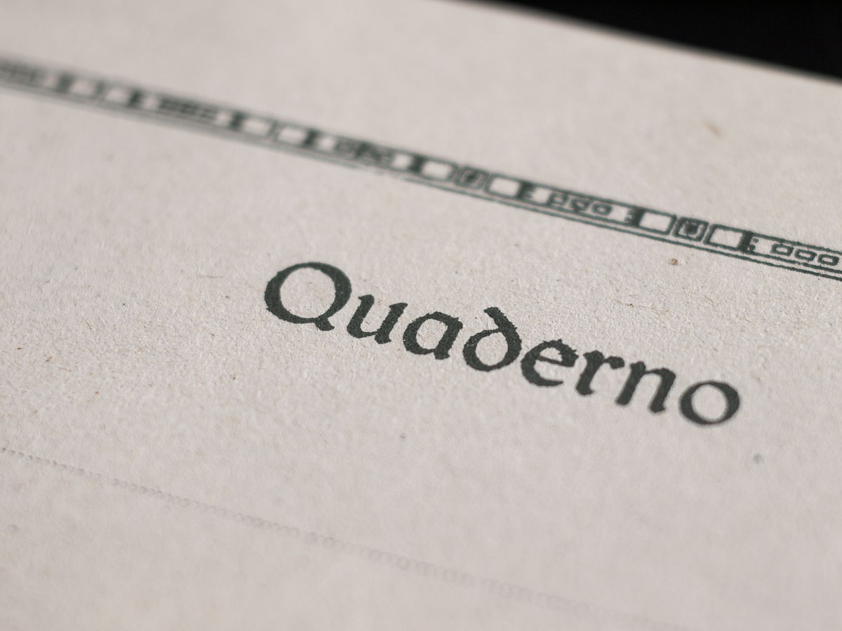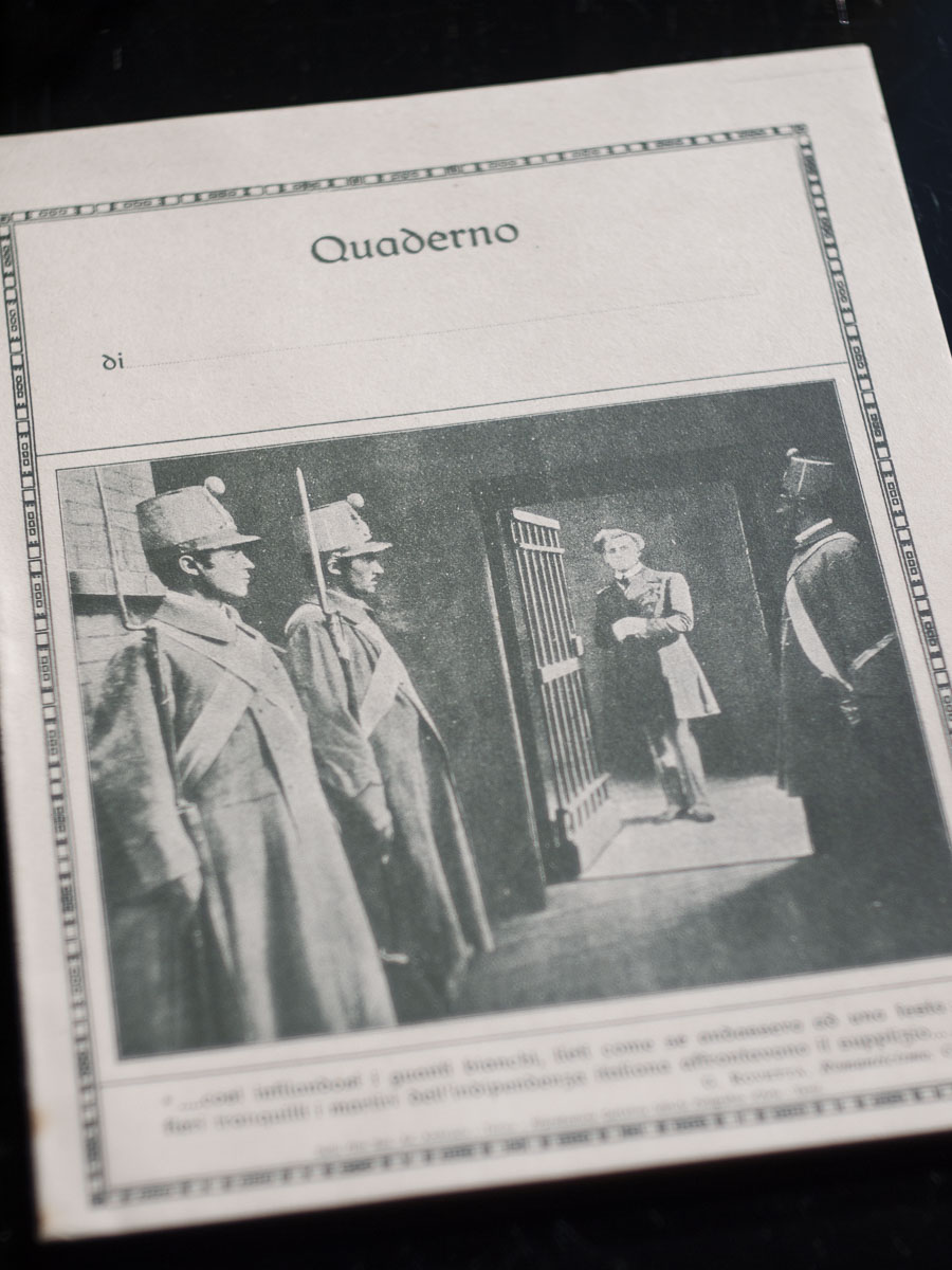 縦20.2×横15.1cmとほぼA5版。表紙には映画原作となったジェローラモ・ロヴェッタ戯曲の引用が付されていました。裏表紙はメーカー名「GGB」のロゴ入り。イタリアの「ノート博物館」のオンラインサイトは発売時期を1920~30年代と見ておりアンブロージオ社が1924年に倒産した事実を踏まえると20年代前半と絞りこんでよさそうです。
