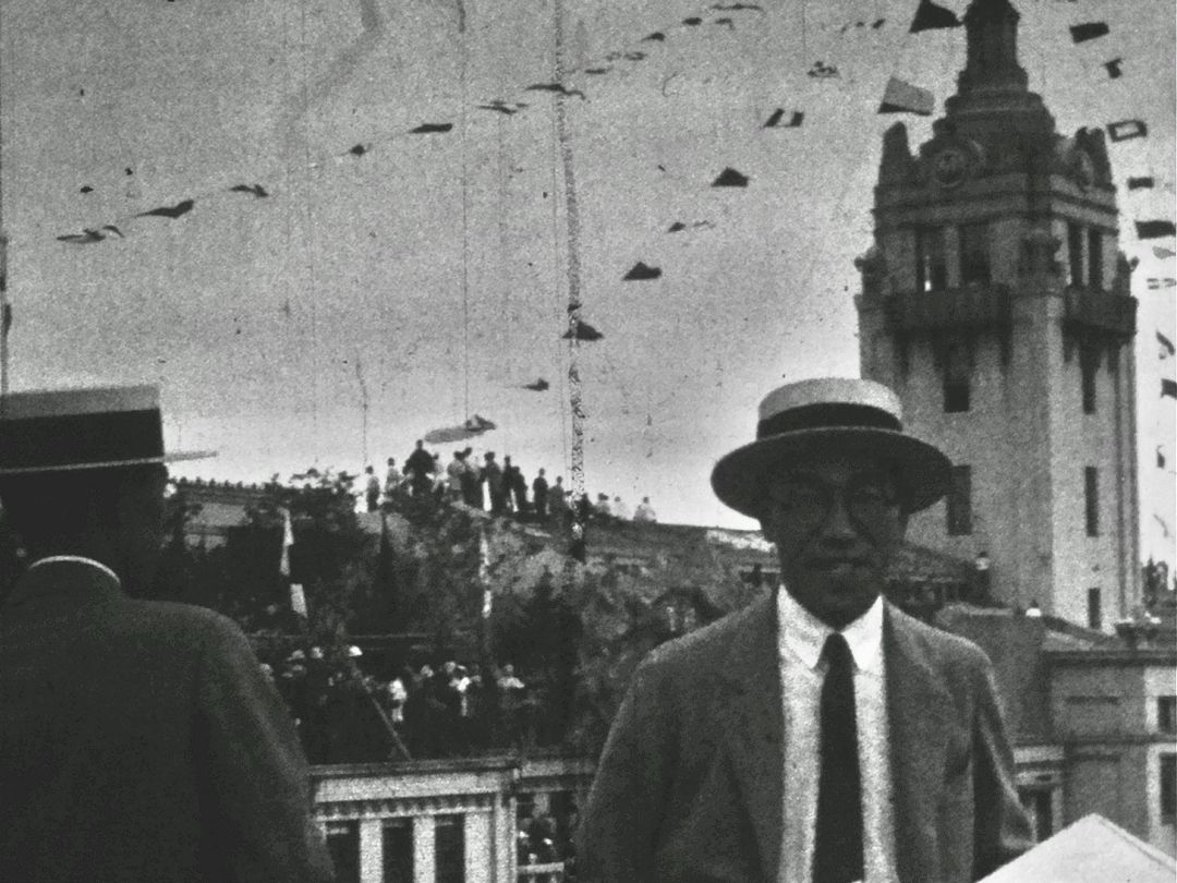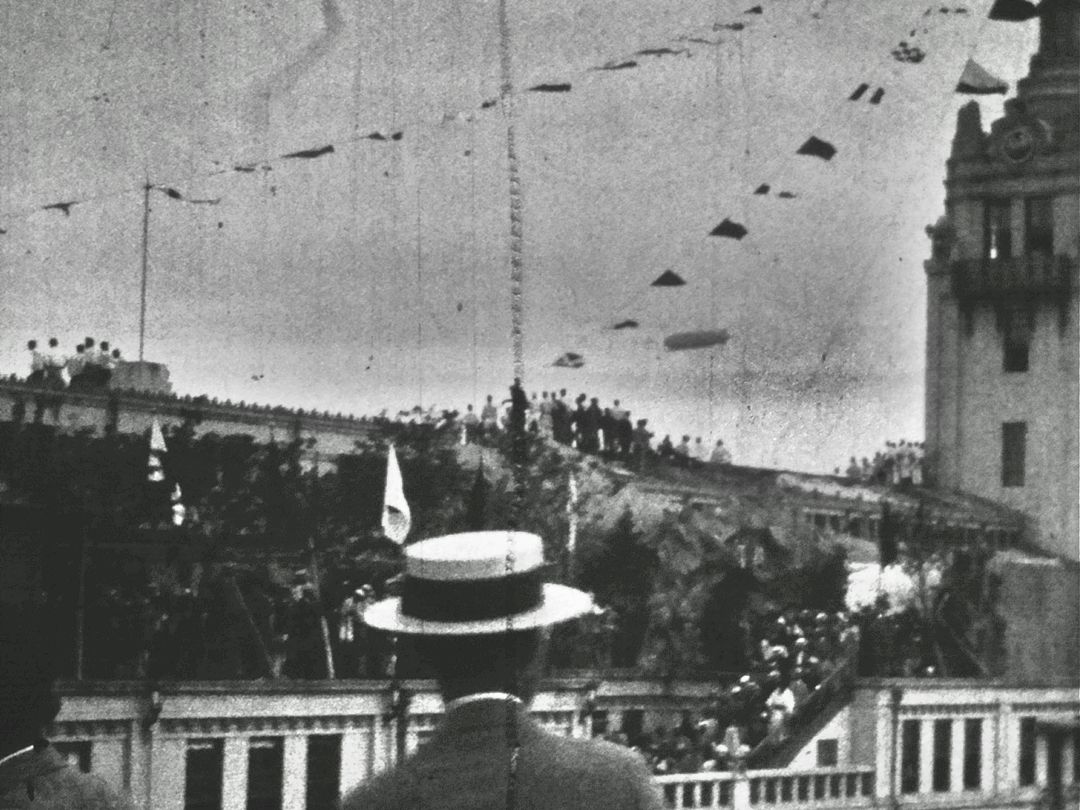 1本目の動画『ツエ伯号着の三井より望む』は昭和4年8月19日に飛来したツェッペリン号と、それを見守る観衆を日本橋の三井のビル屋上から捉えたものです。