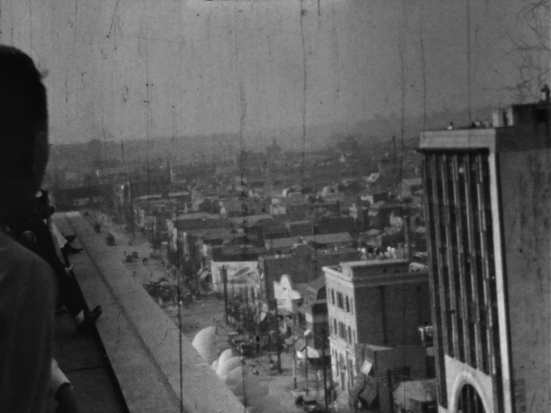 屋上に「エムプレス食堂」の看板が設置された向かいのビル(三越?)に人が集まっている様子。カメラがそのまま視点を左に移動させていくと、通りを挟んで撮影者のいるビル屋上が写り込んできます。