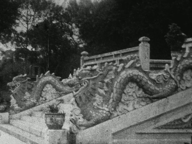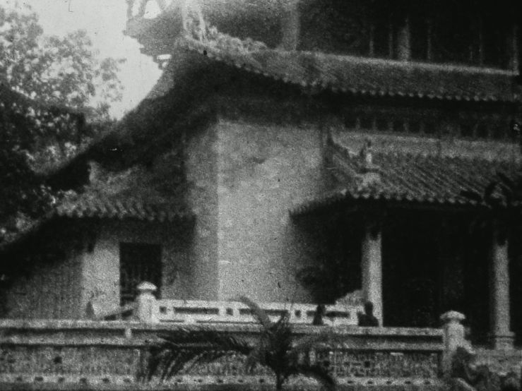 フィルム前半はゴルフをしている姿が記録されています。地元の子供さんがキャディーを務めているようです。コース内の移動に使用されれている馬車がカメラの前を横切っていきます。フィルム半ばで木々が鬱蒼と茂る川辺の映像に切り替わり、しばらくすると中華風の宗教建築物が映し出されました。