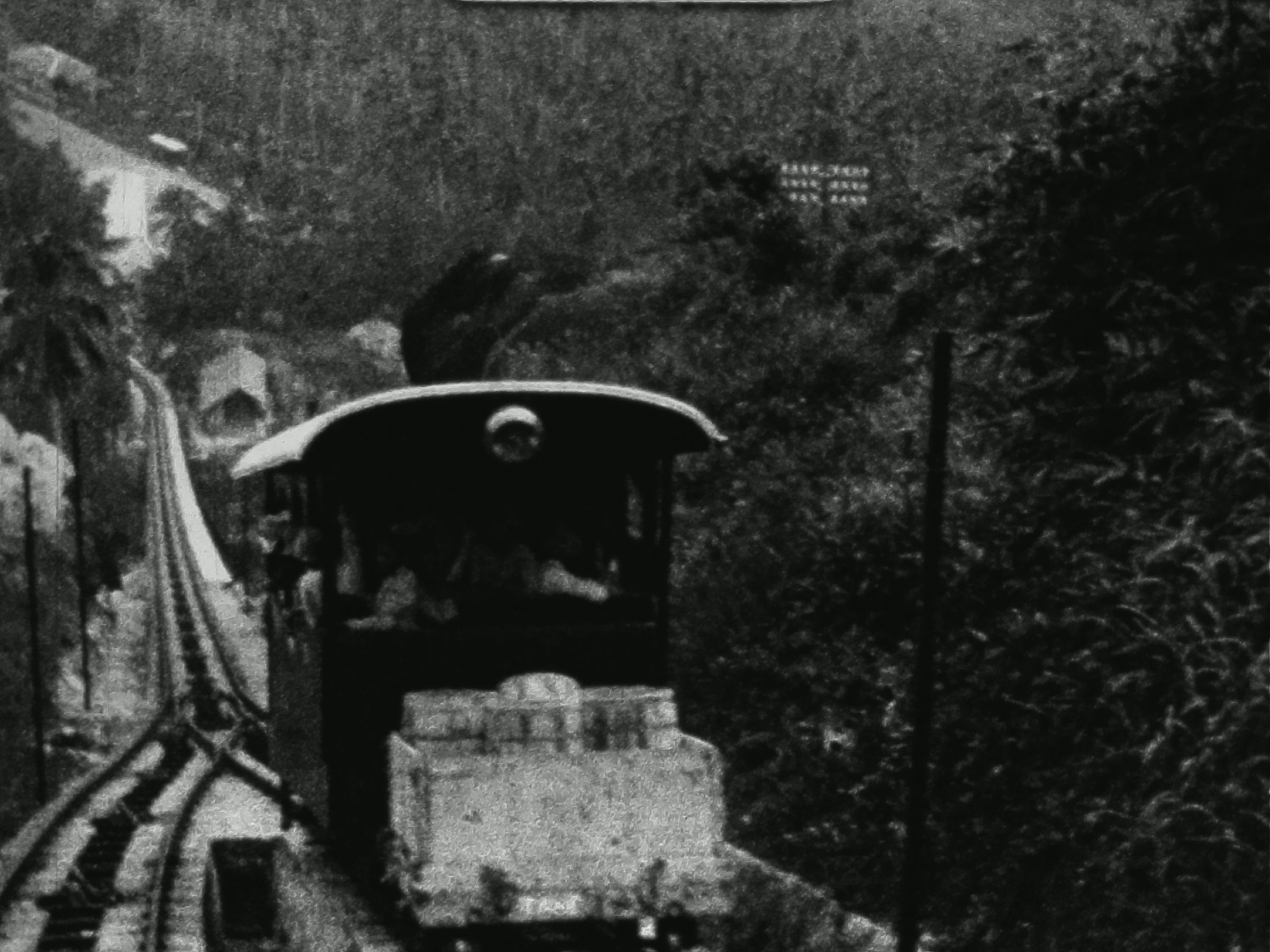 その後、ペナンヒルを登っていくケーブルカーが登場。上りと下り列車がすれ違う個所だけ複線になっています。現在は高速ケーブルカーとして人気を呼んでいますがその開通は1923年。初期の車両を捉えたものと思われます。