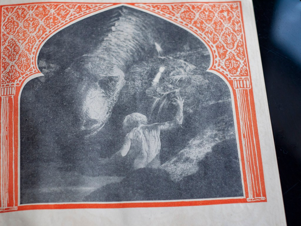 木版画調の枠に飾られた4枚のスチル写真が大きくあしらわれ、下に粗筋がまとめられています。筋をまとめた人物の名は明記されてはいませんが堂々とした擬古文の調べは素人離れしておりそれなりに名の知れた活動弁士、又はそれに類した経験を積んだ持ち主と思われます。硬質なゲルマン古神話が「もののあはれ」に違和感なく置き換えられているのには驚きました。